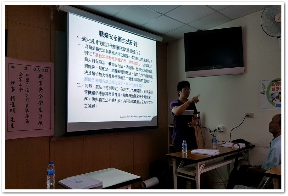 本來以為今日要上的課程是『消防演練』,沒想到是『職業安全衛生法規』,講師是『台塑石化公司』麥寮廠區企業工會的理事『賴進順』先生,不過沒關係!『職業安全衛生法規』以前一樣也曾經上過,落實安全法規所規定的事項,才能當個不沾鍋的人