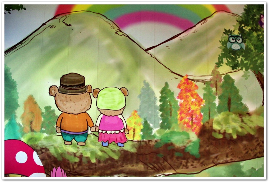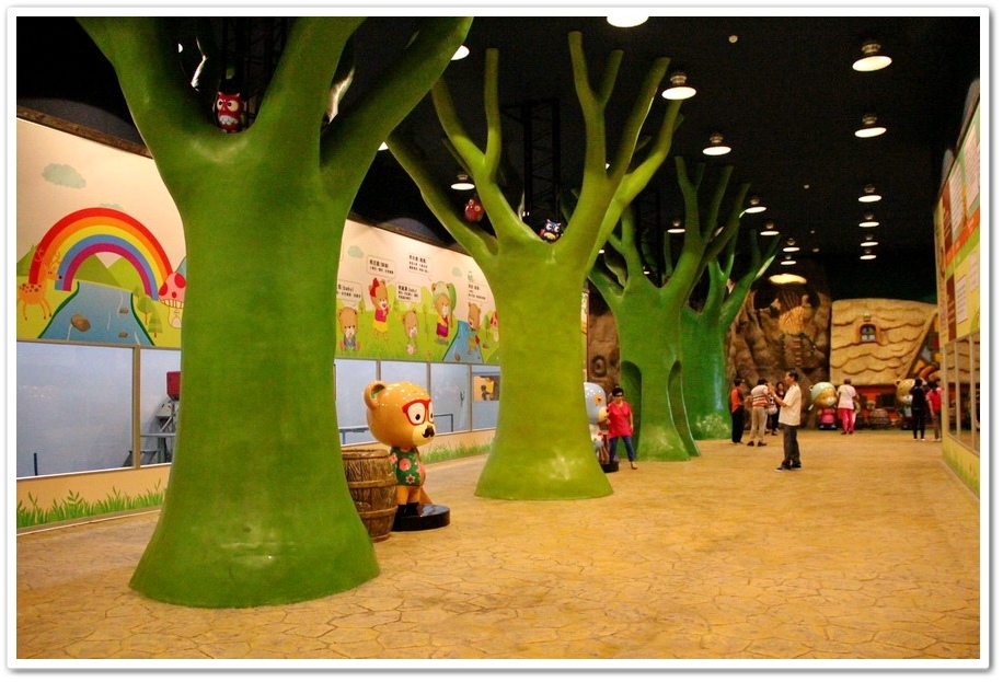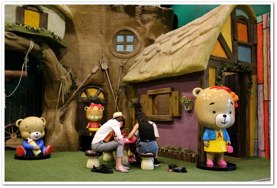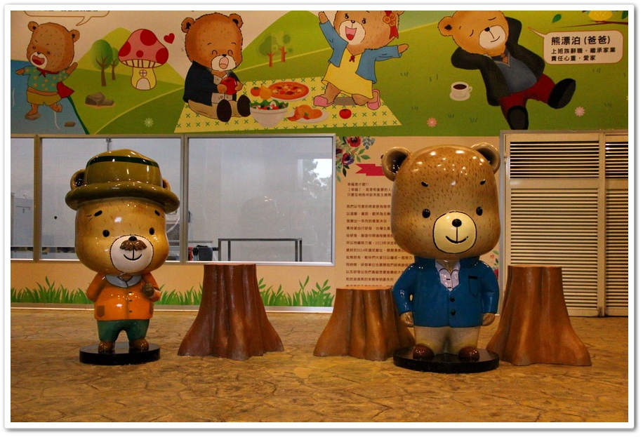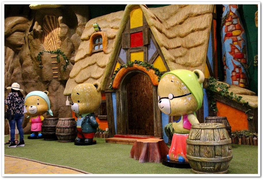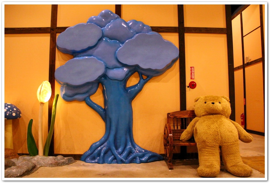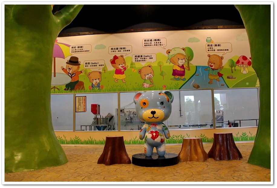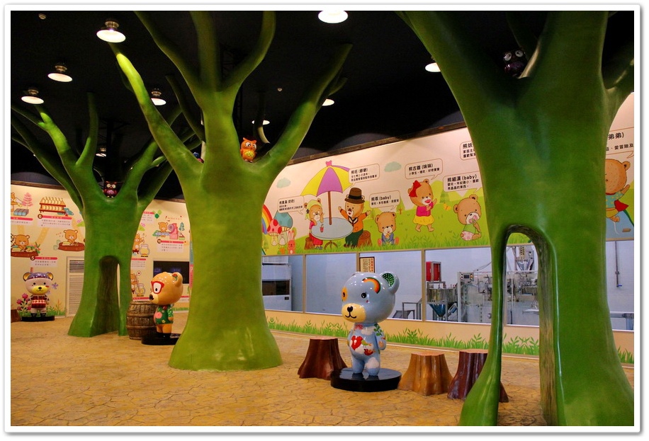 『熊大庄森林觀光工廠』打造成童話世界,到處都有著大大小小、不同樣貌的小熊雕像佇立在童話小屋旁供遊客們拍照,每個地方都讓人捨不得離去想一拍再拍,為了讓場景更像童話世界,工廠裡連柱子也都裝飾成了大樹呢!