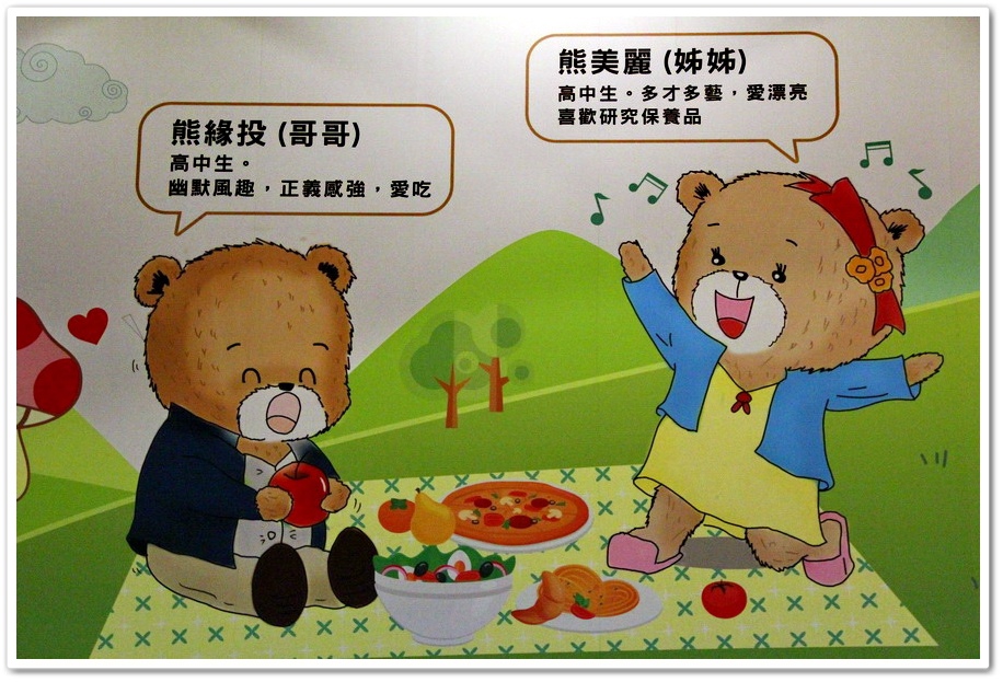 另一頭『熊緣投哥哥』與『熊美麗姊姊』在草地上野餐,『熊美麗姊姊』職業是 : 高中生。星座 : 雙子座。印象 : 愛美。特色 : 多才多藝、超級愛漂亮,愛研究保養品