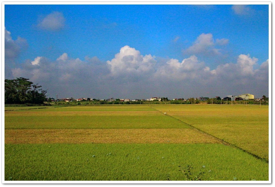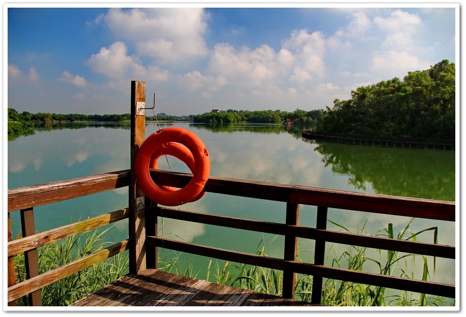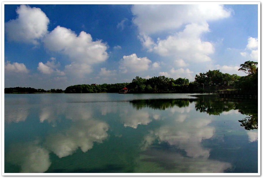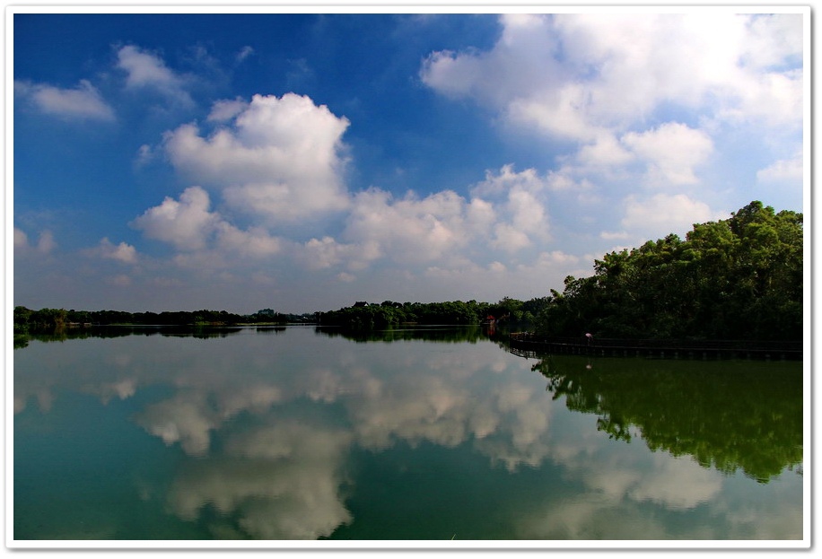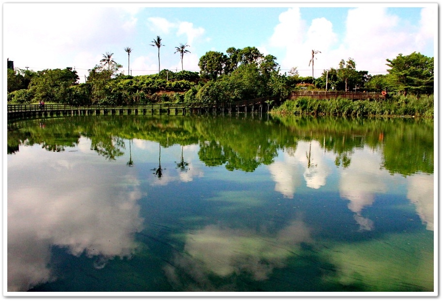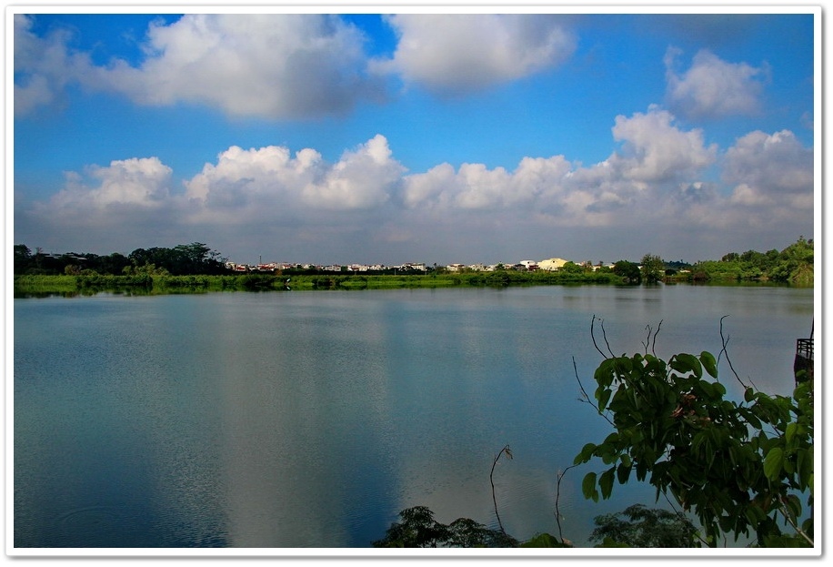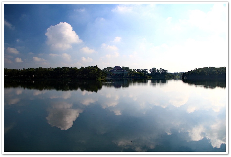 白雲倒映湖中妝點那藍色與綠色區塊的空白