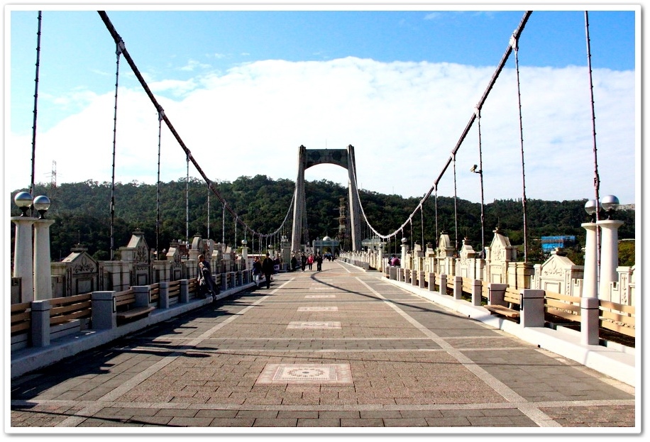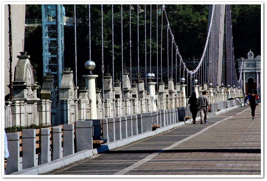 穿越過巴洛克式的浮雕拱門,可沿著紅磚瓷瓦拼貼而成橋面走道,欣賞與『大溪老街』相仿的巴洛克式風格橋身,灰白色的雕花與老街的街景風格相互輝映,更顯古典雅致;走累了,橋上則提供有座位可讓遊客稍事休息