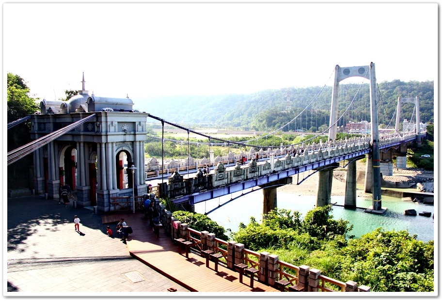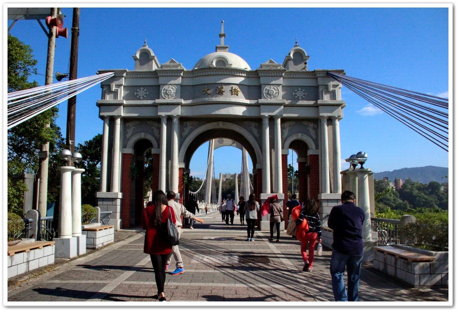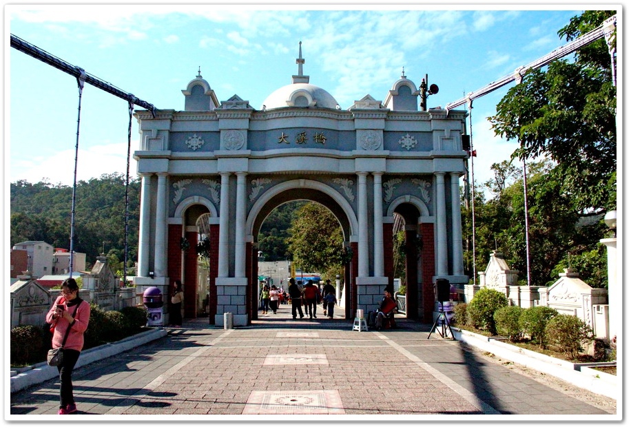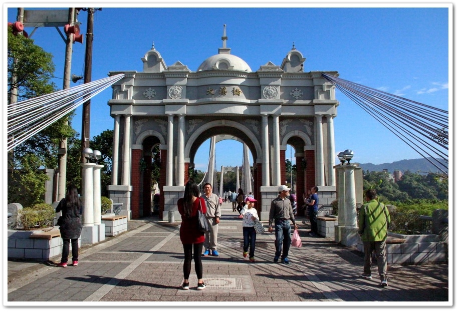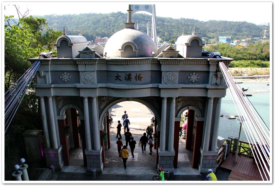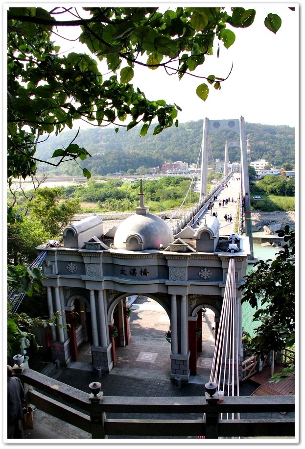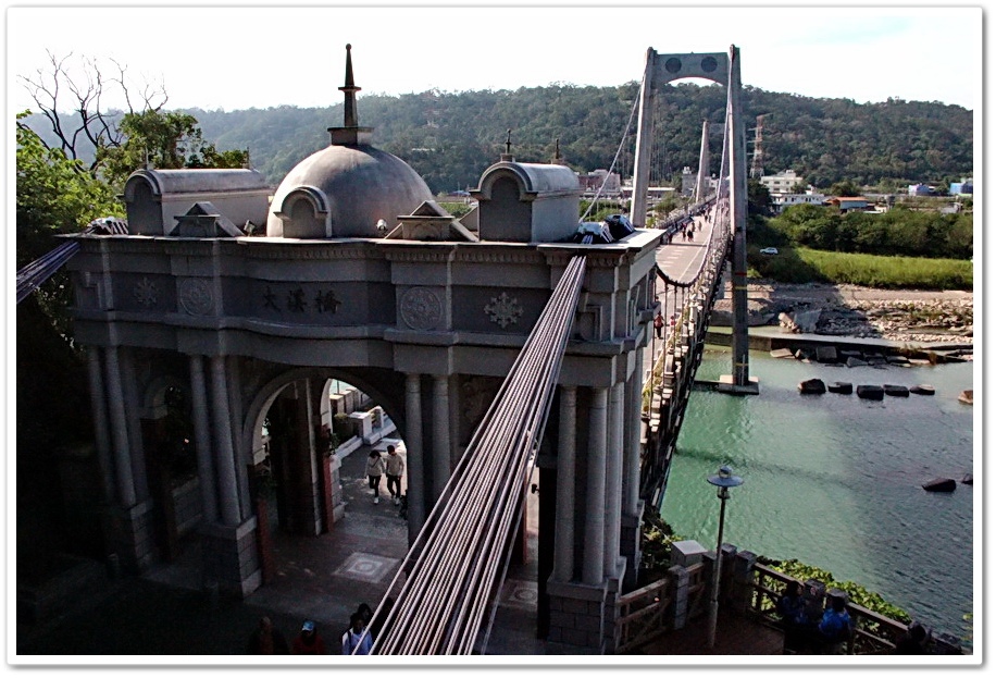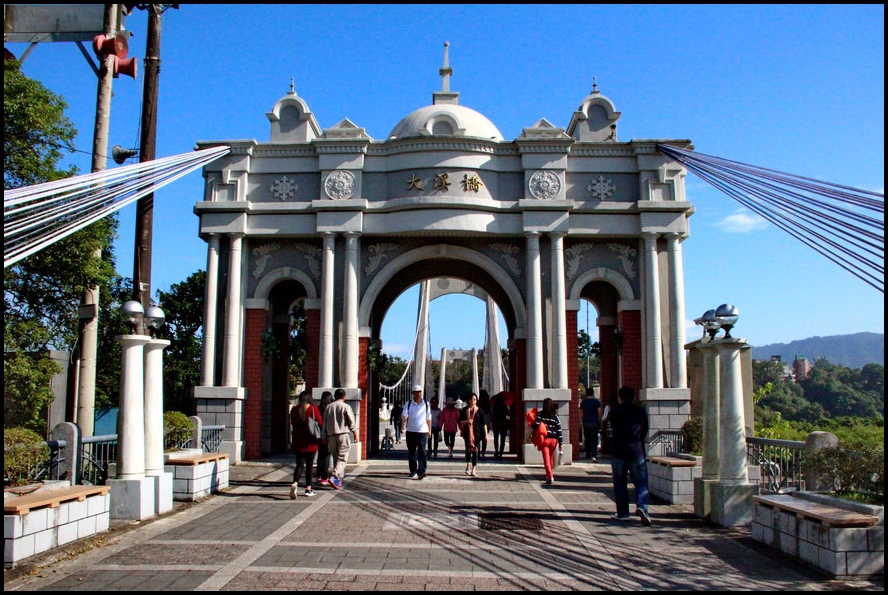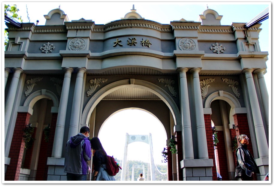 改建後的『大溪橋』,外觀仿造日據時代的大溪古吊橋,橋的入口處是復古的拱門造型,加上半圓形式的雕花罩頂,有如城堡般氣派大方