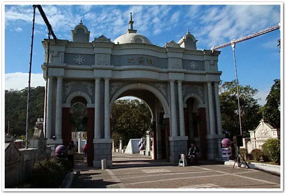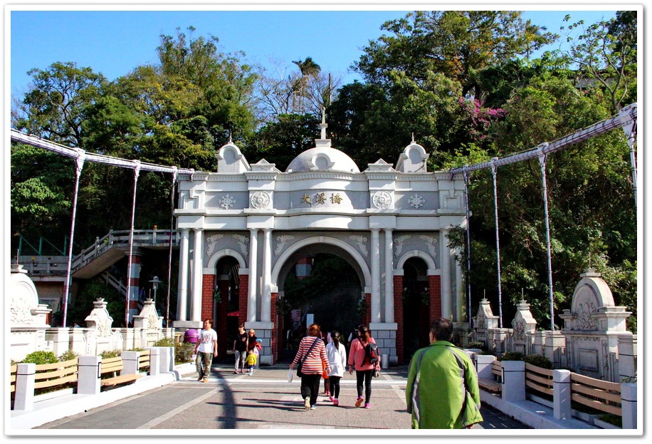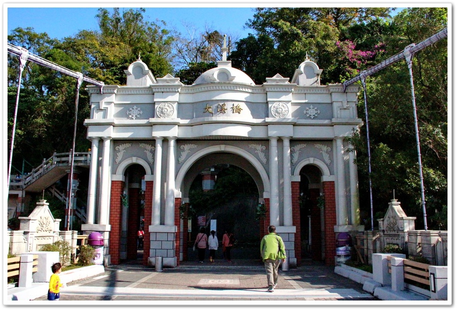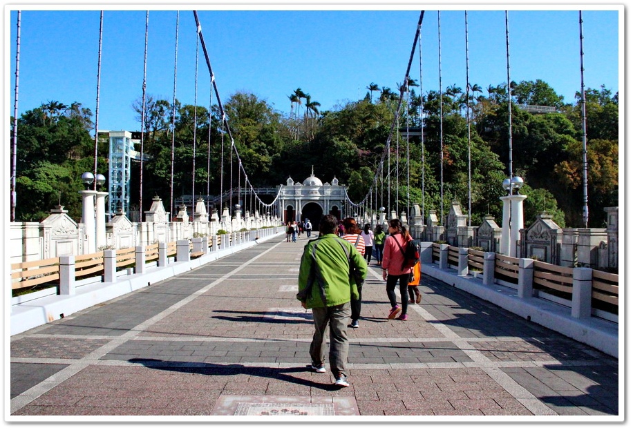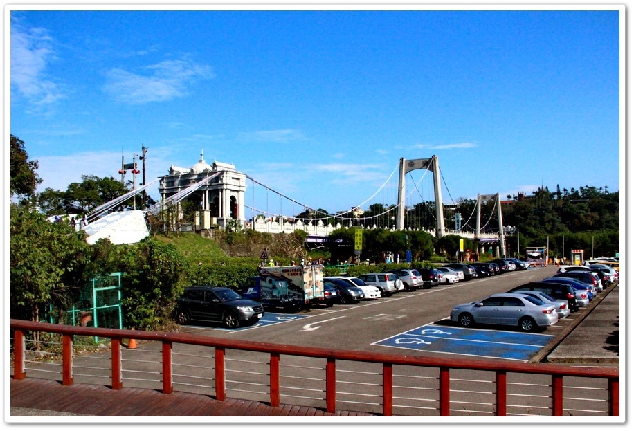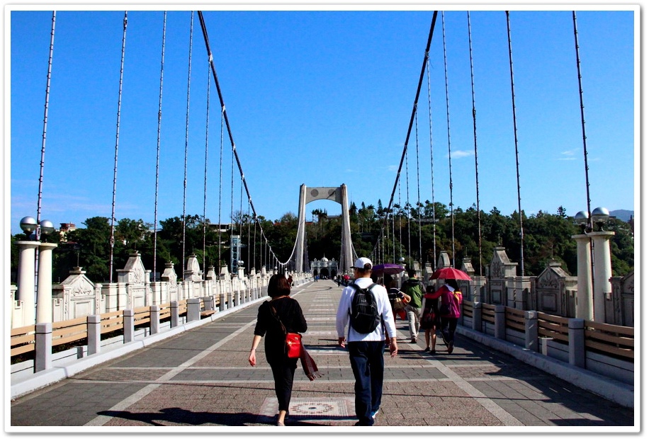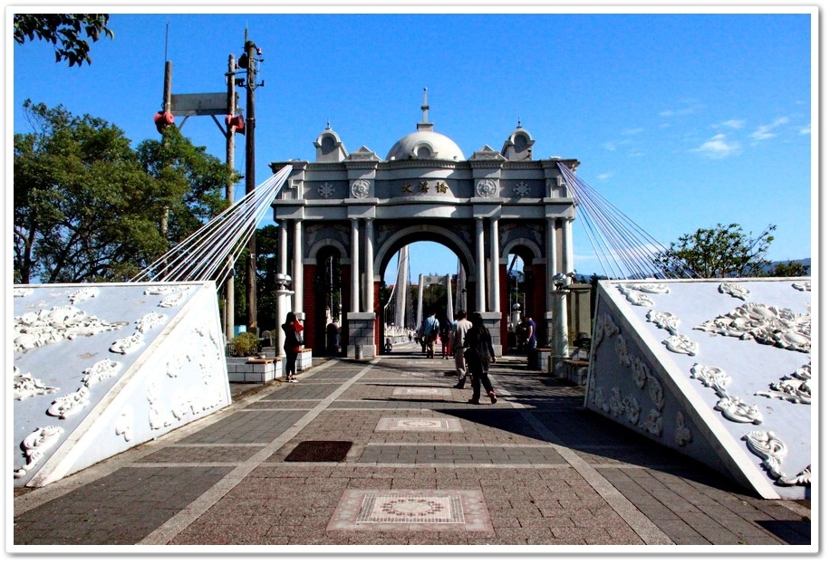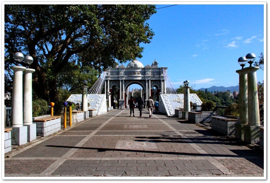 改建後的『大溪橋』,外觀仿造日據時代的大溪古吊橋,橋的入口處是復古的拱門造型,加上半圓形式的雕花罩頂,有如城堡般氣派大方