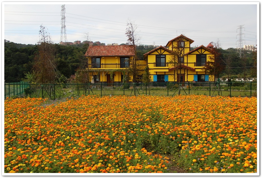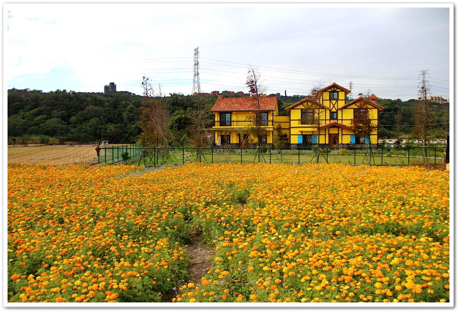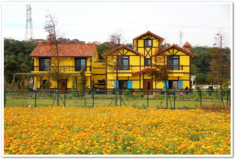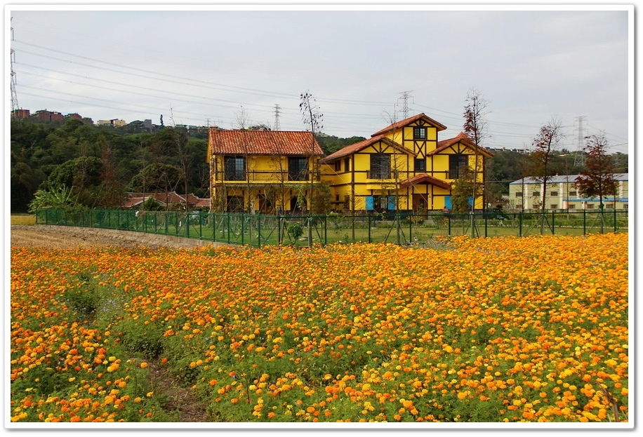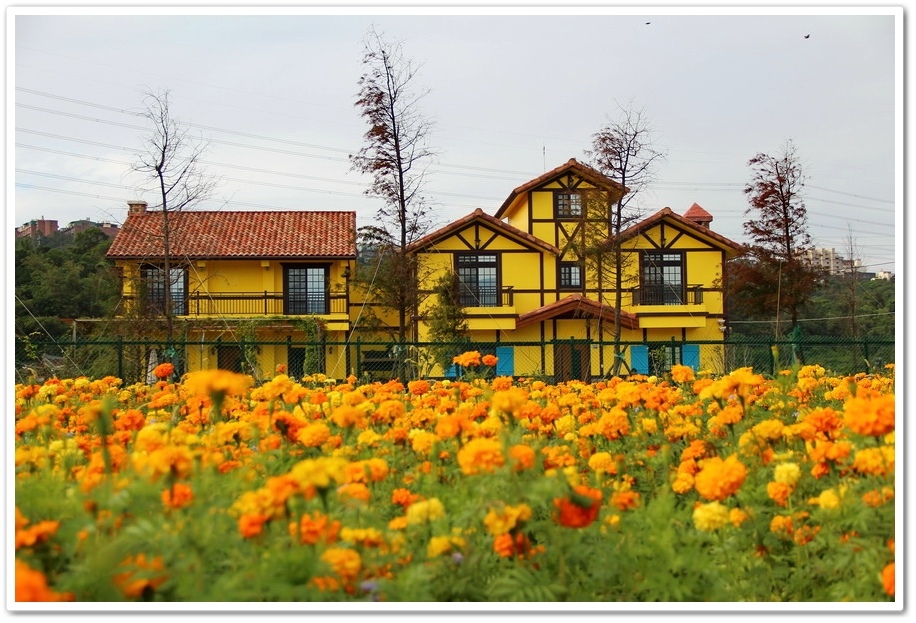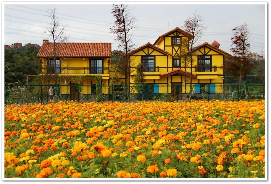 之前在中秋節的時候,『黃色小屋』前是種白色『韭菜花』,現在則改種『金盞花』,所以『金盞花』比之前的白色『韭菜花』要漂亮許多,而且『金盞花』的顏色也跟『黃色小屋』很搭,共同描繪出一片的花海世界