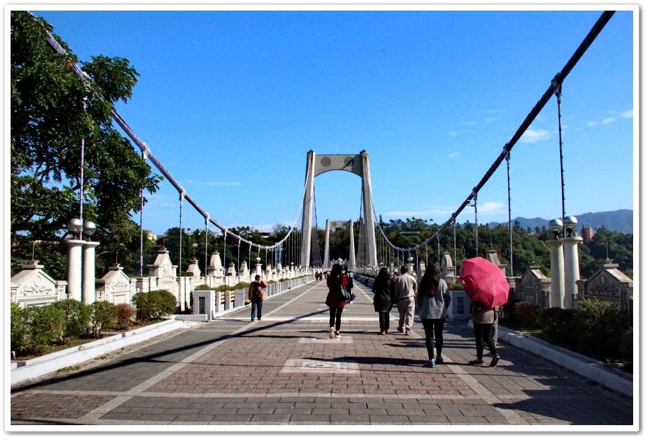 不過橋樑兩側以鋼索懸吊,兩端橋頭入口為復古的拱門造型,橋面兩側人行步道設計花台牌樓,讓整座橋樑外型呈現復古吊橋型式,又富有巴洛克風味