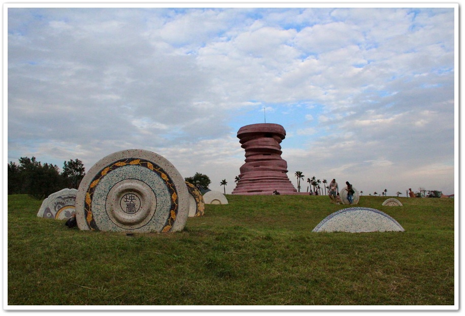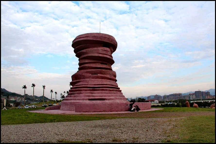 這個是園區中最高的地標《坯》,作者:林舜龍。年份:2009。材料:鋼構、水泥、GRC。尺寸:直徑25公尺×高15公尺