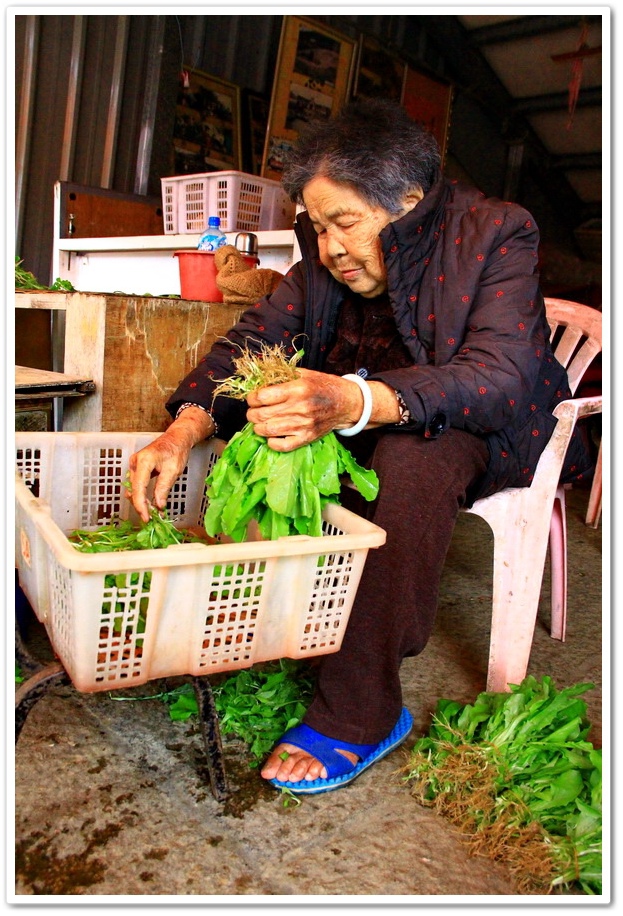 這位阿嬤是『李登輝』總統的弟媳,身子還很硬朗,一邊撿著剛從菜園裡摘起來的青菜,整理後準備賣給遊客,並一邊跟我們訴說著『源興居』的歷史
