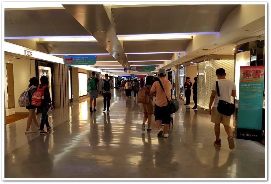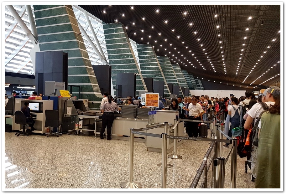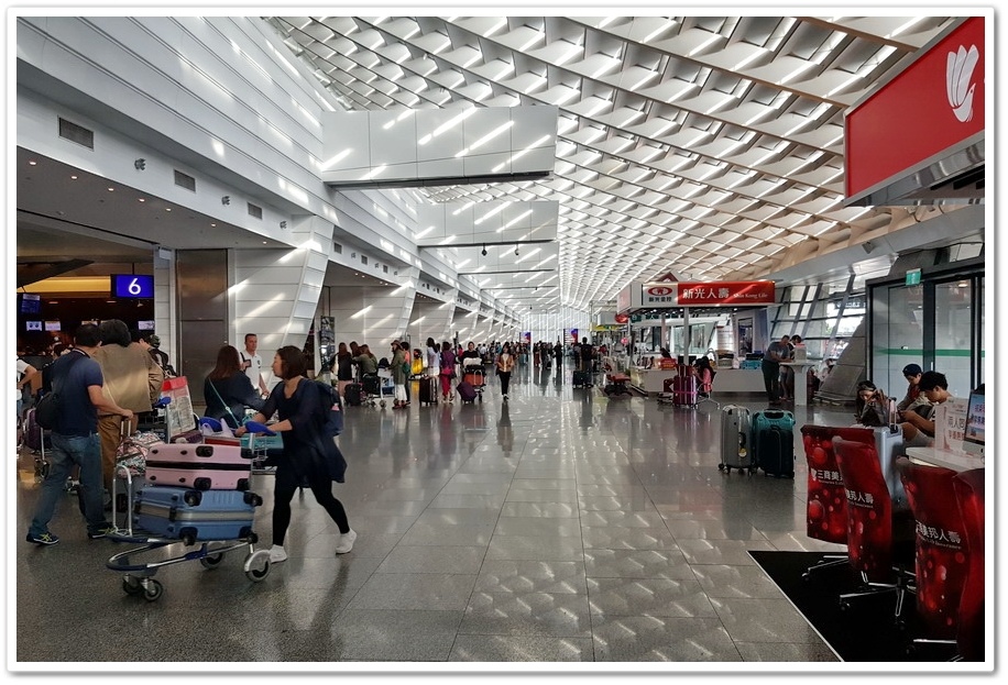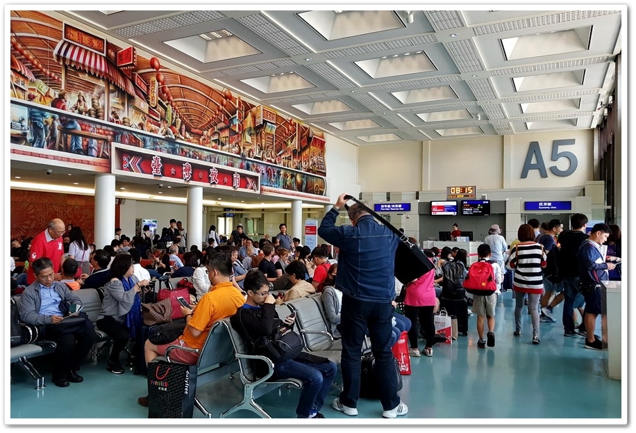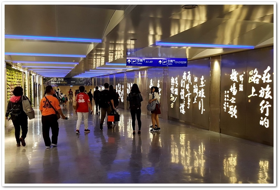 早上8點15分來到出境大廳,出境大廳裡有世界獨有的『台灣夜市』宣傳圖騰,有芒果剉冰、小籠鮮肉湯包、滷味、肉圓、蚵仔煎、珍珠奶茶、仙草冰、木瓜牛奶、豆花、肉粽等夜市小吃揚名於國際