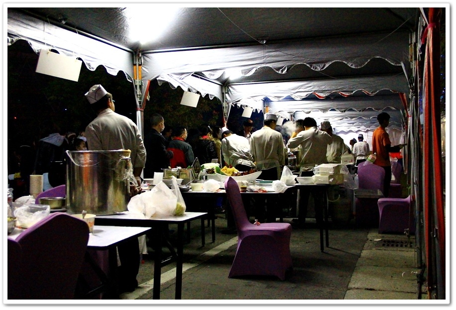 深夜裡肚子有點餓,『三好國際酒店』的廚師群在飯店外擺攤,供應參加晚會的民眾飲食,有飲料也有牛排,每樣最低50元,最高100元,我買了一小塊牛排來吃100元,飯店級的牛排比路邊攤好吃多了