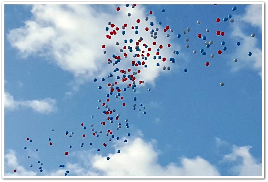 國旗歌奏完放彩色氣球,點綴成亮麗的彩色天空,本來說好繞場一周後會發放國旗徽章,可是那些政治人物把持麥克風不放,一直在那邊屁小,只好回家並且爬山去