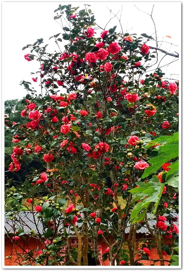 最後遊覽車停放在『鳳凰山農場民宿』下方的一處遊覽車停車場,我們在下車沿著山坡走上去農場民宿,民宿為一間三合院的建築,隱藏在青翠山林的山腰處,庭院前種滿各式花卉,像這株茶花正綻放著花朵迎接我們的到來