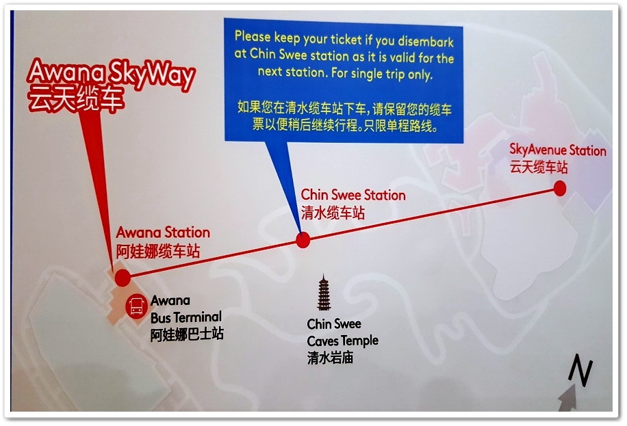 纜車總共只有三個站,即『起點站』、『中途站』(清水岩廟)、『終點站』共三個站,纜車乘坐比台灣『貓纜』還要舒適無聲