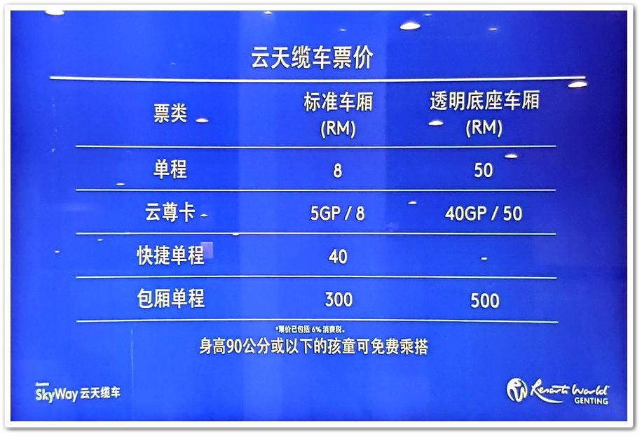 標準車箱單程一般票價馬幣8元,團體票價7元,透明底座車廂單程50元。『雲尊卡』標準車箱8元,透明底座車廂50元。快捷單程40元。標準車箱包廂單程300元,透明底座包廂500元,如果以一般票價馬幣8元=台幣60元來講,比我們的台灣的『貓纜』還要便宜