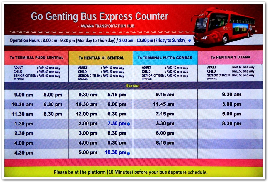 從吉隆坡前往『雲頂高原』可以在富都中環車站(Pudu Sentral)、吉隆坡中環廣場車站(KL Sentral)、鵝嘜布特拉輕快鐵車站(Terminal Putra)或萬達廣場車站(One Utama)乘坐Go Genting巴士,在抵達雲頂高原纜車站後,再搭乘纜車即可到山頂