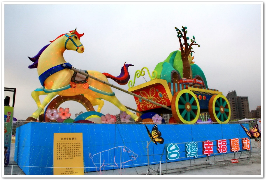『2018台灣嘉義燈會』副燈『台灣幸福驛站』,以馬車結合小火車為主意象,設計上以一馬當先的回首駿馬,結合阿里山與森林小火車的音樂馬車型態為發想,並讓小火車以旋轉動態方式呈現,基座更特別以光雕來呈現台灣的型態,帶給您全新的賞燈體驗,並駐足感受