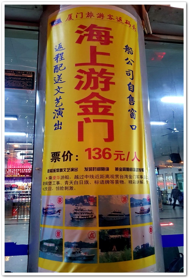 可是這金廈海域乘船夜遊『海上看金門』活動看板,是我在『廈門旅遊客運碼頭』拍到的,價格是人民幣136元,136元/ RMB X匯率4.7=639元/新台幣,回程一樣是送表演,但怎麼會跟導遊『阿秀』講的不一樣