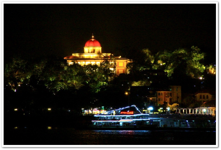 上圖是從『環島路』遙望的『鼓浪嶼』,有著紅色圓頂的是鼓浪嶼『八卦樓』,建於清光緒33年(1907年),總建築面積3710平方公尺,高25.7公尺。圓頂高10公尺,有8道棱線,置於八邊形的平台上,頂窗呈四面八方二十四向,故稱『八卦樓』
