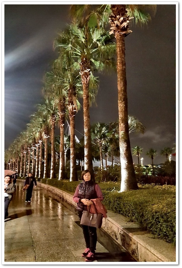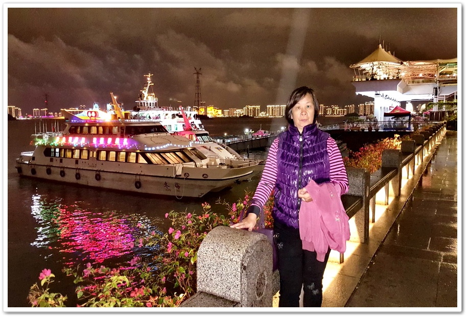 晚餐後增加的金廈海域乘船夜遊『海上看金門』自費行程,全車只有我們夫婦兩人沒有參加,其他團員都上船遊車河去,不過我們由『廈門旅遊客運碼頭』漫步到『三丘田碼頭』,河岸旁大樓燈光炫麗變化,水道中七彩霓虹閃爍的觀光船來回穿梭,我們在細雨中緩步觀賞,一樣不亞於坐在船上的眼界,但卻更能親身感受那媲美於淡水河岸的美景