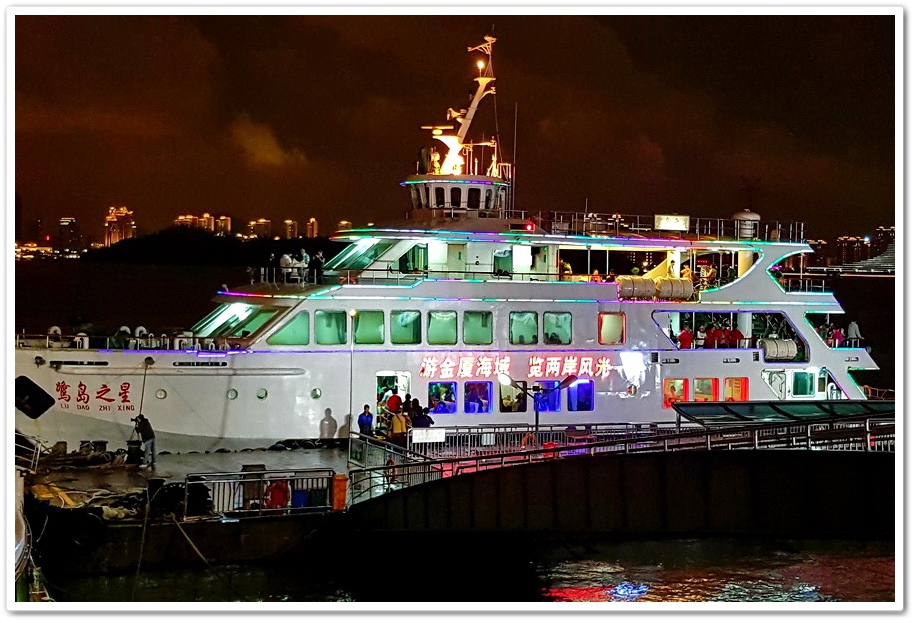 這艘『鷺島之星』就是團員們海上夜遊所搭的船隻,遊船一般分為兩層或三層,一層為封閉船艙,遊客只能隔著窗戶玻璃看景色,不方便拍照,但一層不需要額外付費,有船票就可以。二層或三層是半開放的,可以體會海風的吹拂,更重要的是可以依欄杆拍照,把金門等幾個島嶼作為背景攝入畫面