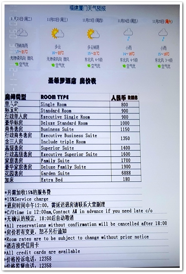 這是『聖希羅大酒店』的價目表,房間價格從單人房人民幣800元,到花園套房人民幣6888元都有,而且還有海釣船,供遊客體驗海釣餐廳的樂趣,『聖希羅大酒店』是一家四星級商務型酒店,酒店地處繁華的商業中心,內部設施完善,是集客房、餐飲、休閒、娛樂、會議的商務酒店