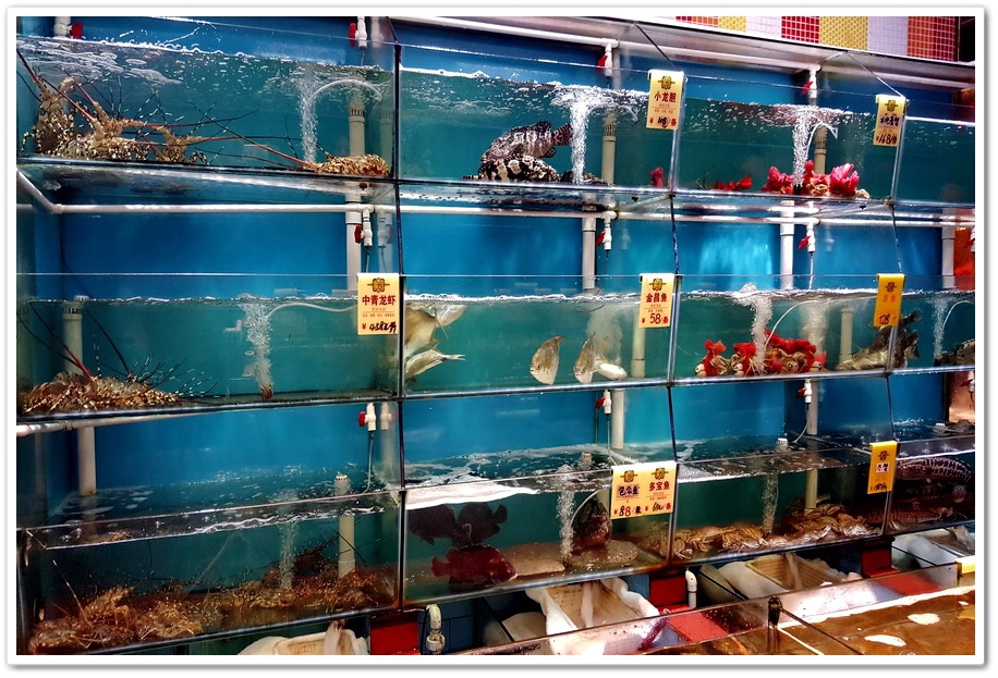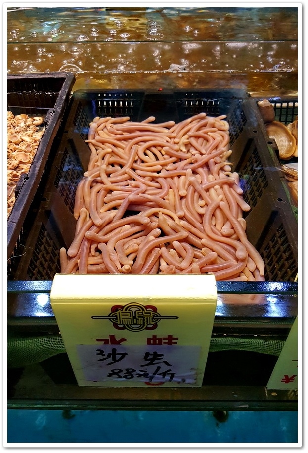 在『南海漁村餐廳』門口擺設許多活海鮮,是要讓顧客現點現炒的海鮮美食,這一簍是金廈海域特有的『沙蟲』,一斤88元人民幣,『沙蟲』加入豆芽菜及少許辣椒,以大火快炒後其鮮脆的美味,雖然沒有海參、魚翅、鮑魚的名貴,但味道鮮美脆嫩,為海參、魚翅所不及