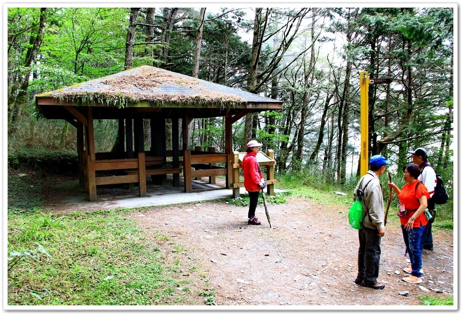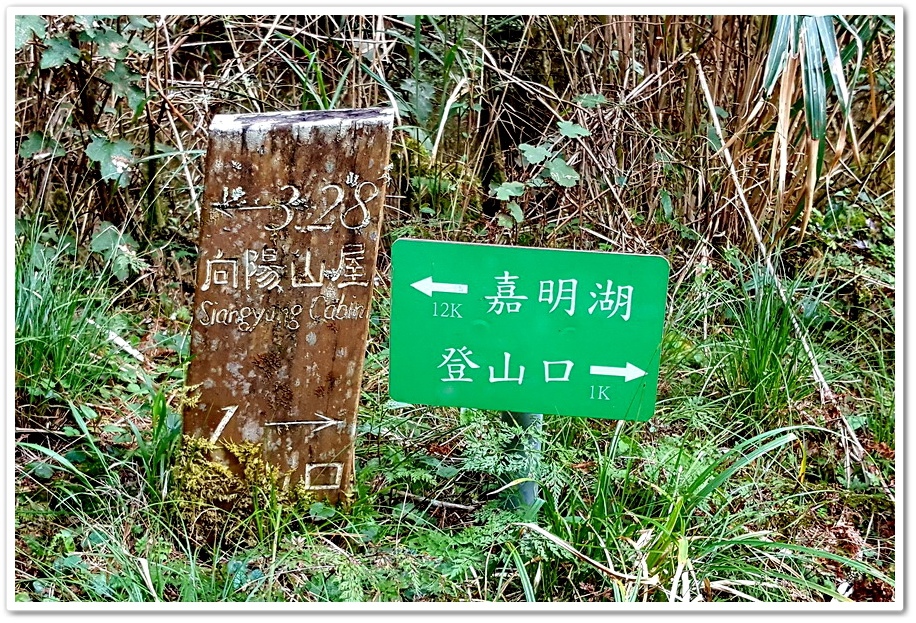 隨後來到這一處指標,前往『向陽山屋』還有3.28公里,前往『嘉明湖』還有12公里,12公里耶!我們從步道口走到這裡是1公里,就已經走了30分鐘,以此速度如果要走到『嘉明湖』豈不是要6個小時,那來回就要12小時耶!像我們這種軟腳蝦,怎可能到達『嘉明湖』