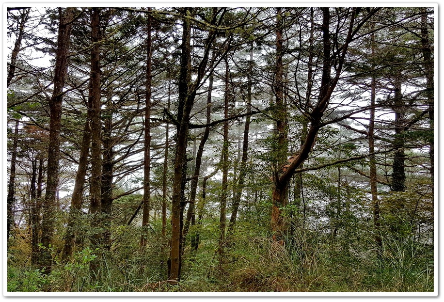我們在第一座涼亭稍做歇息,不一會兒一股強勁山風襲來,山風吹響樹梢的聲音由遠而近,宛如一場大雨稀哩嘩啦的聲響,讓人聞之驚恐,隨後雲霧馬上壟罩整個森林,其速度之快,讓人有點措手不及