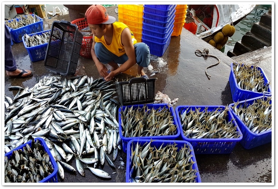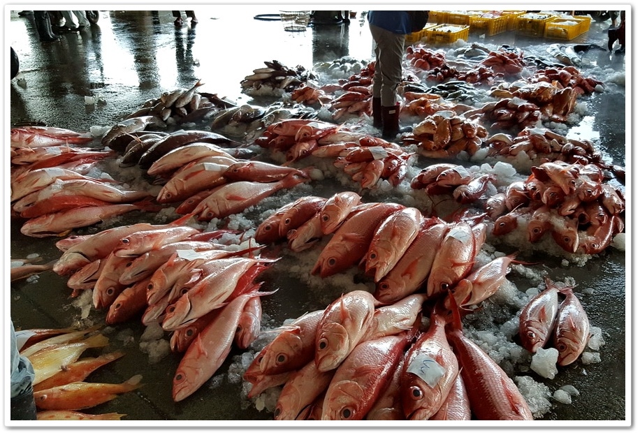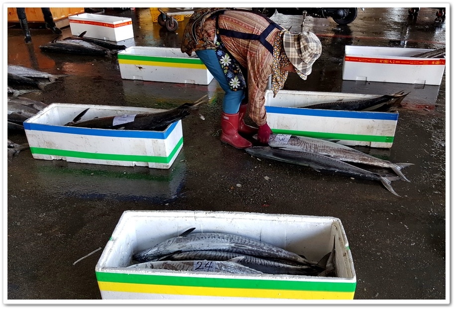 擺在地上的魚穫有些已有買家,未經允許不能亂碰,因為這是大盤商競標的地方,但遊客們都很識相地不去影響忙碌交易的買賣家們,遊客如果真的想採買魚穫,緊鄰碼頭拍賣魚市的攤位就是在地人採買魚穫的一般魚市,忙碌程度不輸拍賣市場,魚的鮮度也一樣