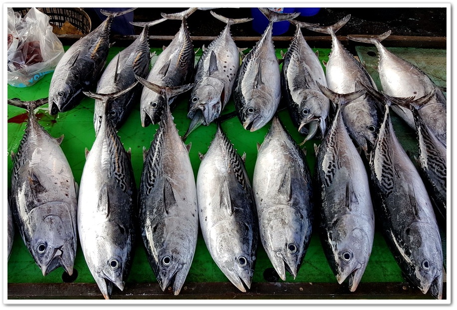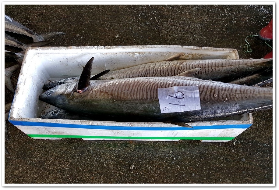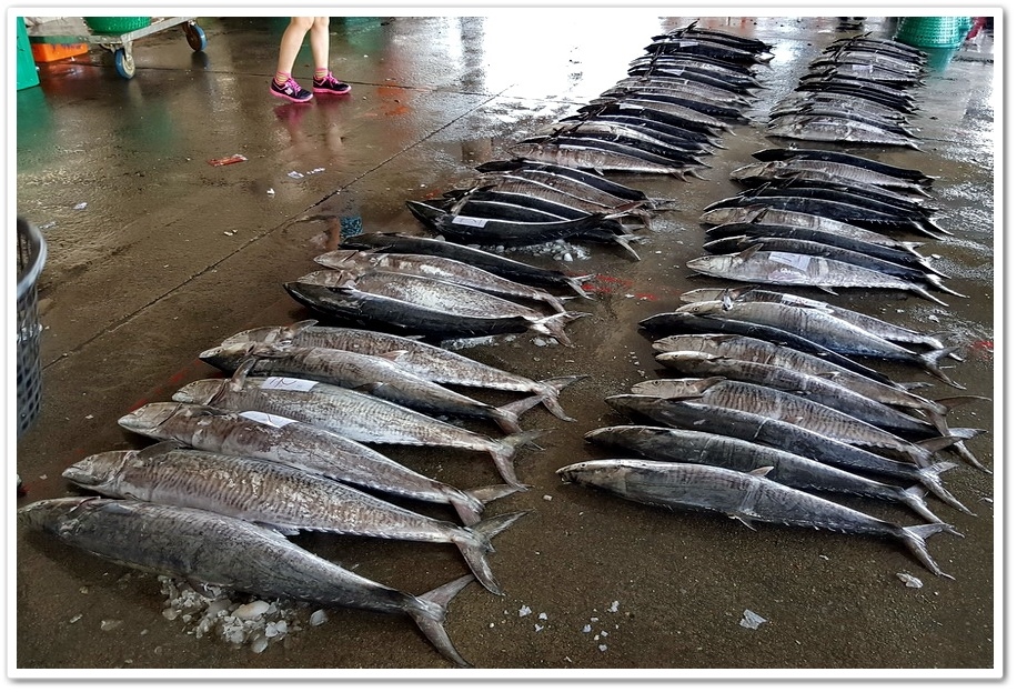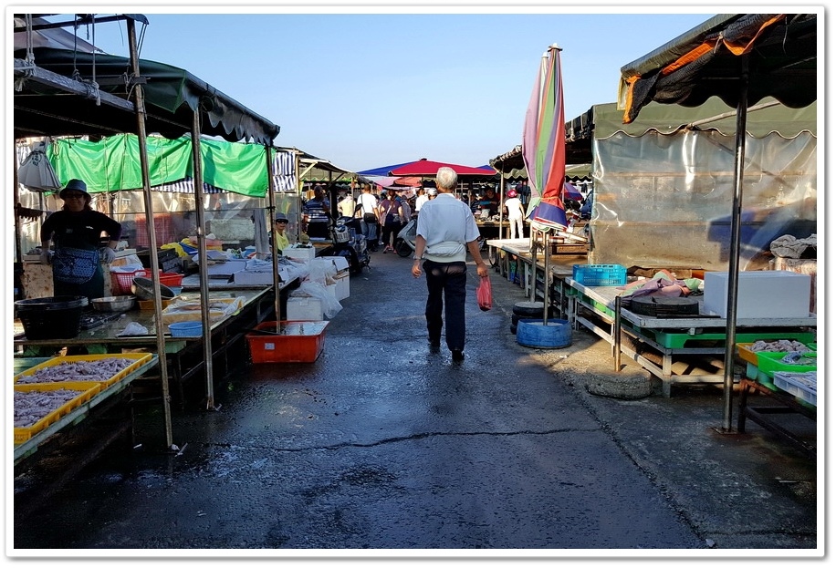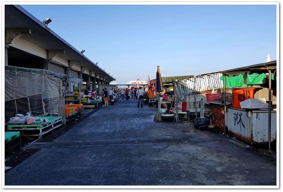 剛進魚市場大門,就是兩排在露天廣場搭起遮陽帳的攤位,並在攤位上擺起各種新鮮魚穫,這些魚穫幾乎都是剛從漁船卸下來的,魚穫滿滿鋪陳在整個攤位,不僅十分壯觀,種類也很多