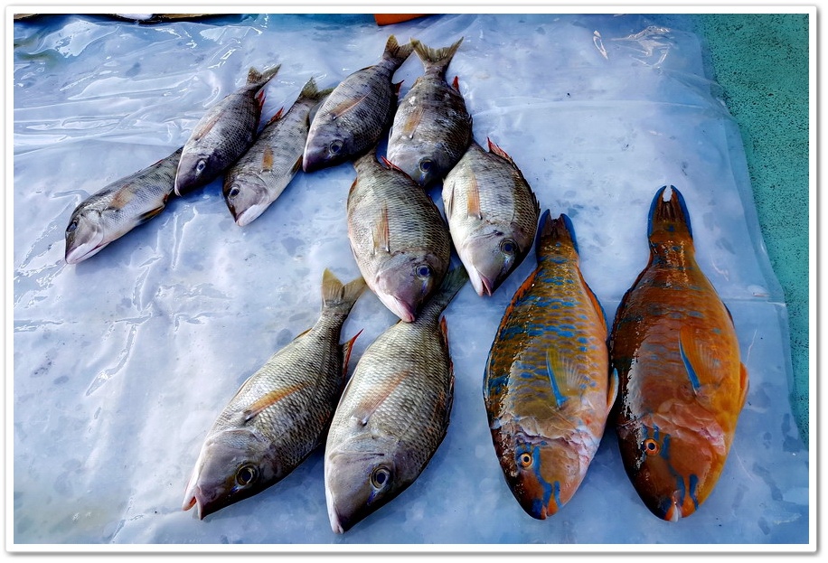 左邊是『青嘴仔魚』,主要棲息於沿岸珊瑚礁、岩礁區外緣、沼澤區、紅樹林區或海藻床區,以軟體動物、甲殼類及小魚為食。右邊是『藍點鸚哥魚』,以啃食珊瑚或珊瑚之共生藻為食,肉質細嫩、適合各種煮法,是常見的鸚哥魚種之一,全年皆有產,以夏季盛產較多