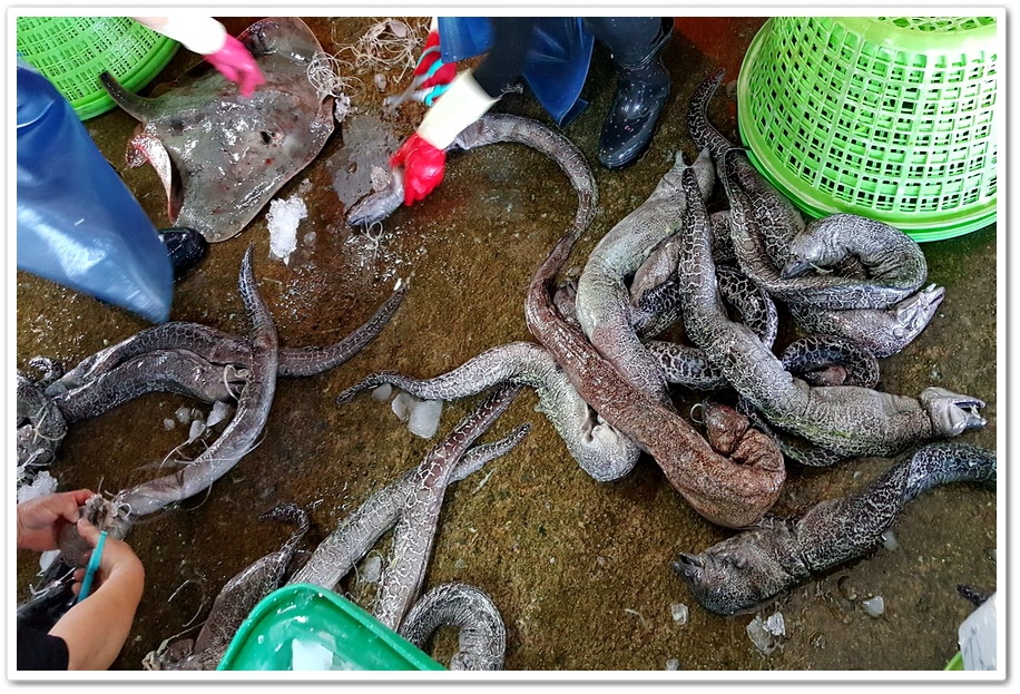 怎麼好像還有『虎鯊』?牠不是保育類嗎?這樣的鯊魚可以吃嗎?或許牠的魚翅比魚肉要更有價值。最後仍然沒看到販賣『馬糞海膽』,原來『馬糞海膽』禁捕多年,卻愈禁數量愈少,澎湖縣政府農漁局今年修正『白棘三列海膽』(馬糞海膽)採捕期,由每年『6月16日至8月31日』修正為『每年7月1日至8月31日』,縮短採捕期為2個月。但仍然還有保育澎湖『馬糞海膽』的團體呼籲,只縮短捕撈期足夠嗎?至少要讓它們一生產一次卵吧!所以這是我未買到『馬糞海膽』的原因。未完待續……