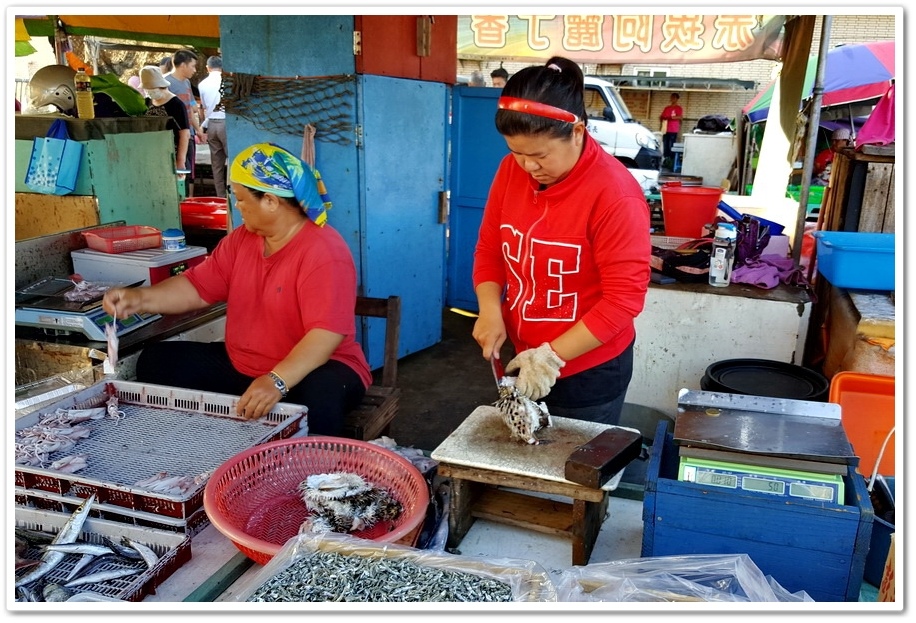 在找尋『馬糞海膽』中,撇見到這攤位正在宰殺『河豚』,很多人認為『河豚』含有劇毒,僅0.5毫克『河豚毒素』就能讓人致命,但『河豚』不一定都是有毒的,台灣漁民稱為『刺鮭』的『六斑刺河豚』,卻是台灣海域絕無僅有的無毒河豚,整隻都可以食用喔!