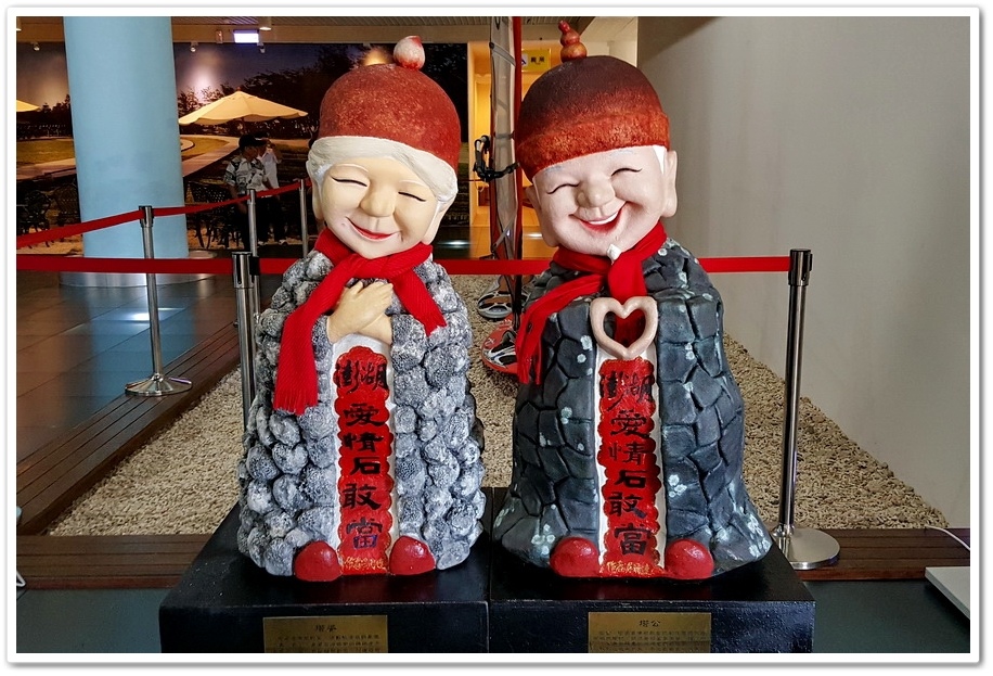 大廳入口處有一對以澎湖『石敢當』做成的『老公、老婆愛情石敢當』,成為『澎湖遊客中心』重要的熱門拍照點。『石敢當』為民間信仰之辟邪厭勝物,澎湖由於移民較台灣為早,加以地理環境特殊,每當秋末冬初的東北季風通過狹窄成管狀地形的台灣海峽時,風力加速,使得澎湖的冬季經常籠罩在凜冽的季風之下,島民時有不測之虞,以致特別崇信鬼神,且其對厲鬼之恐懼尤甚於對神明之崇敬,為防患止煞於未然,除了修建廟宇,還在島上普遍豎立辟邪物