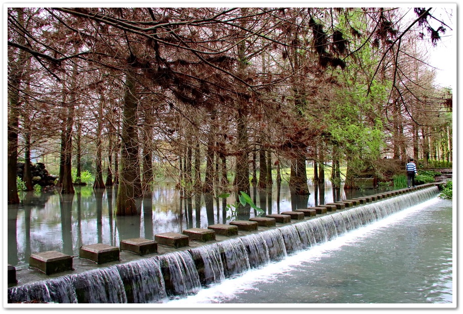 這裡是一處茂密的落羽松森林,松林下的小溪流細細的流竄著,形成美麗景象,這個點也是婚紗攝影師最愛的取景處。溪水流過分流的梳形壩,踩著水泥塊跨過溪水,便會到對岸的另一處出口