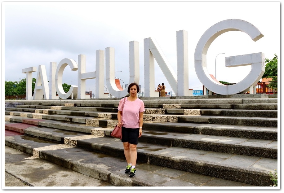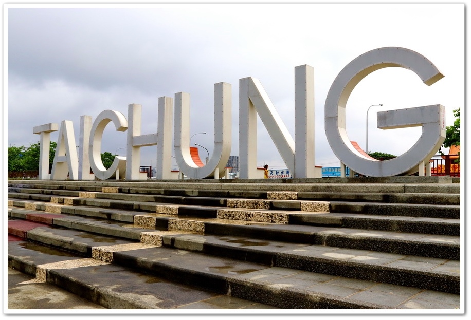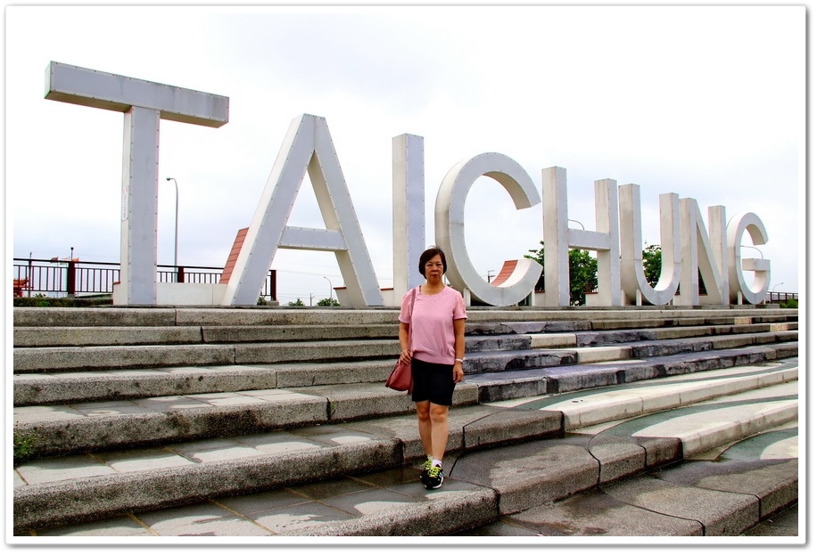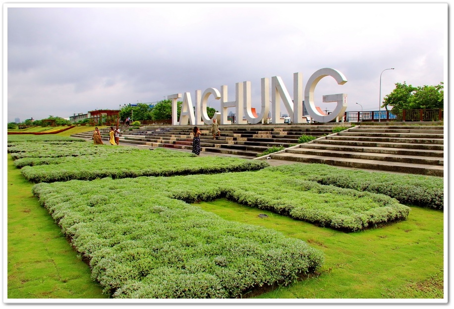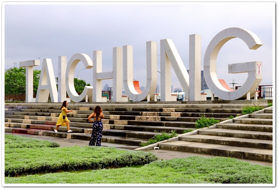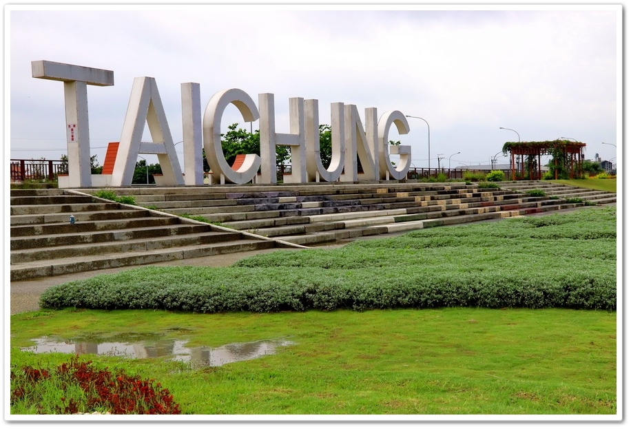 而在大大的『TAICHUNG』英文字母下方,階梯中隱藏著『臺中』的字樣,臺階上面還有漆上白色『臺中』兩個字,及一個水岸廊道標誌