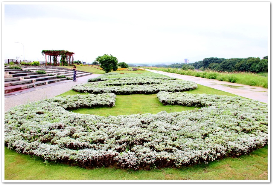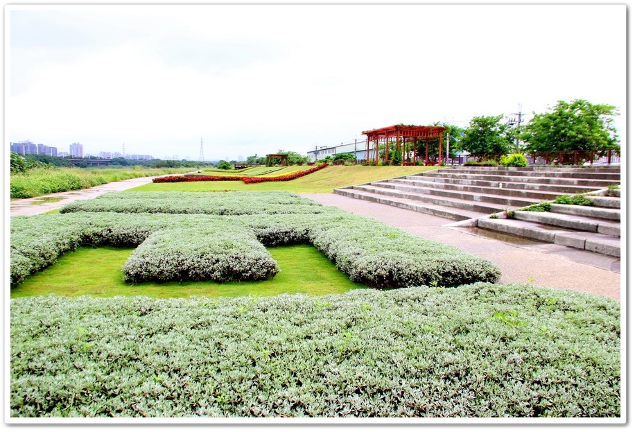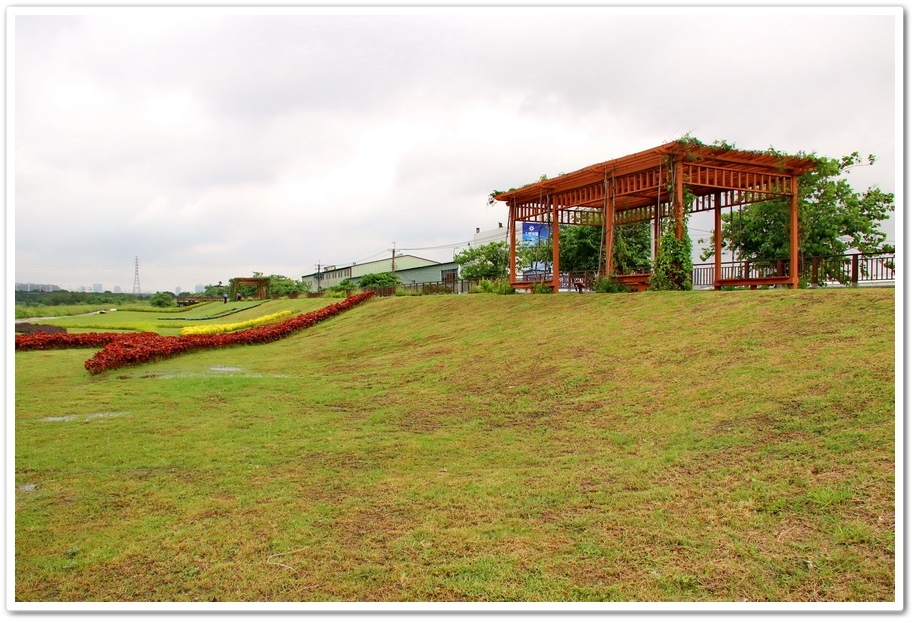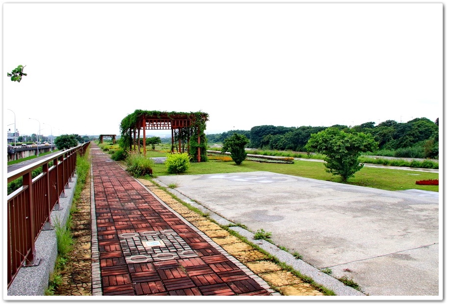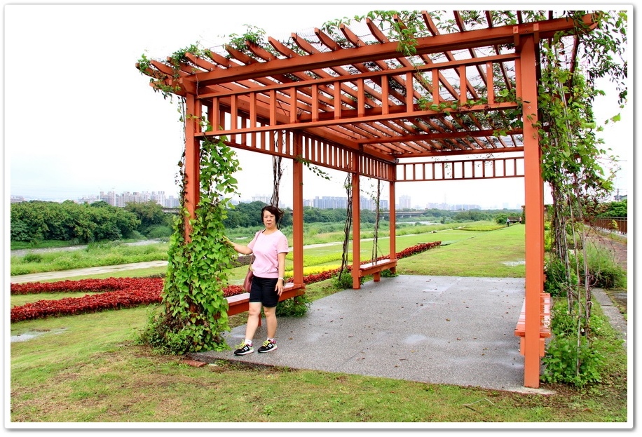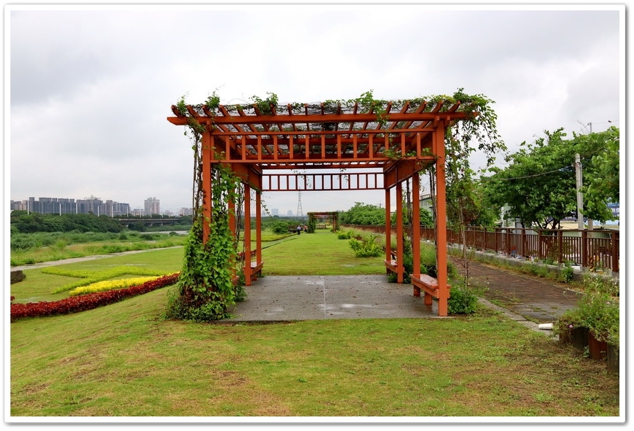 堤防上還設置了涼亭,並且種植九重葛,等這些九重葛長大後,就是一座綠意盎然的花架,個人滿期待日後『筏子溪迎賓水岸廊道』整片綠地上開滿花朵,在這涼亭下方乘涼賞景,將是一種相當愜意的事