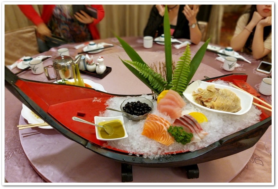 好了!開始上菜囉!首先上的是冷盤,有三種生魚片及鹽水鵝肉