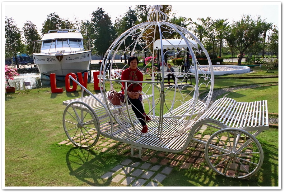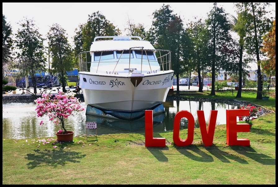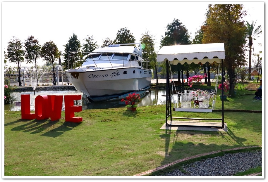 庭園許多愛情元素的裝置也很驚豔,最大亮點是湖泊裡有一艘真的船!