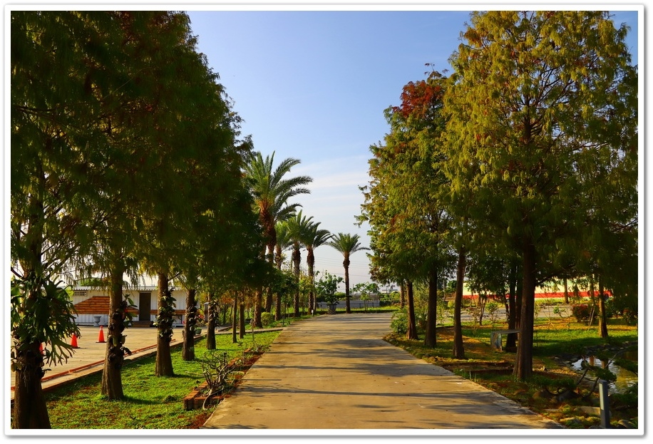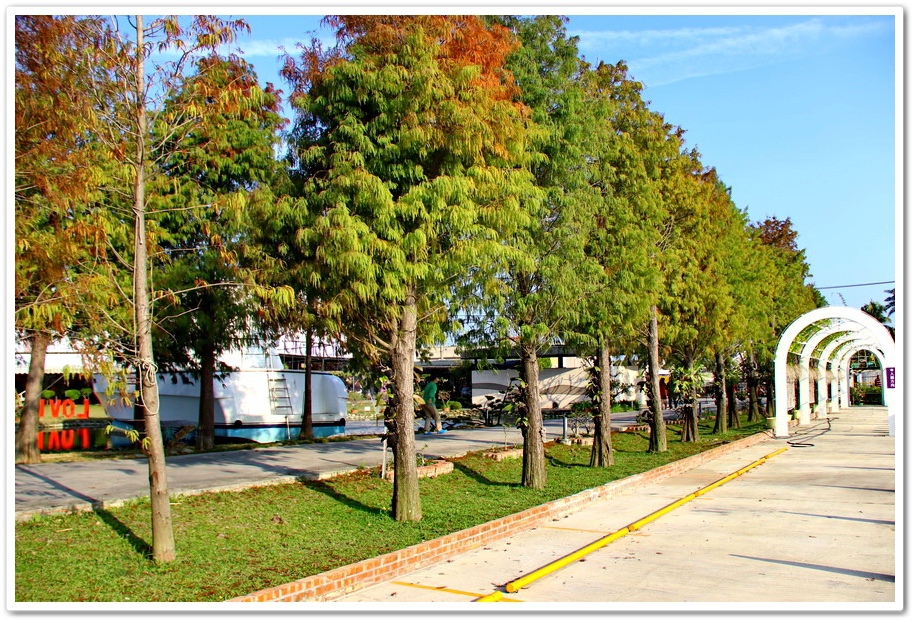 湖邊種植落羽松及各種花木,湖中鴨鴨戲水,營造悠閒樂活的時光