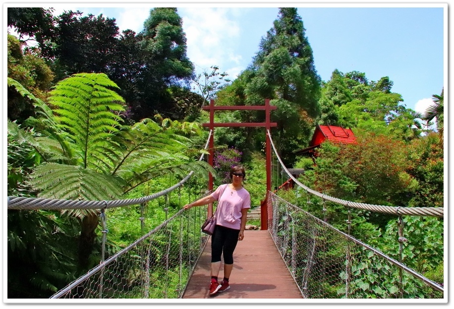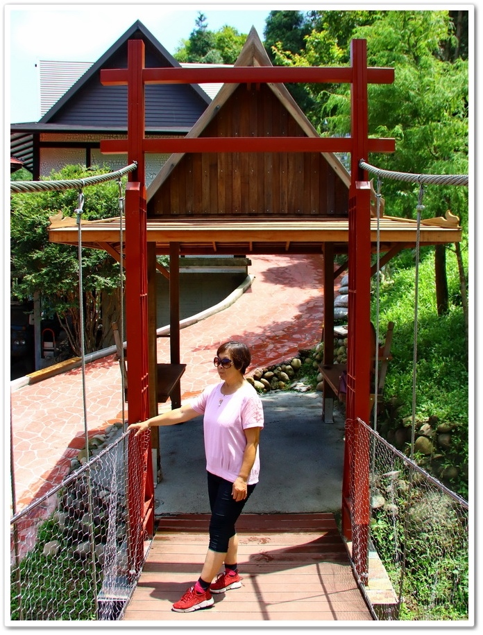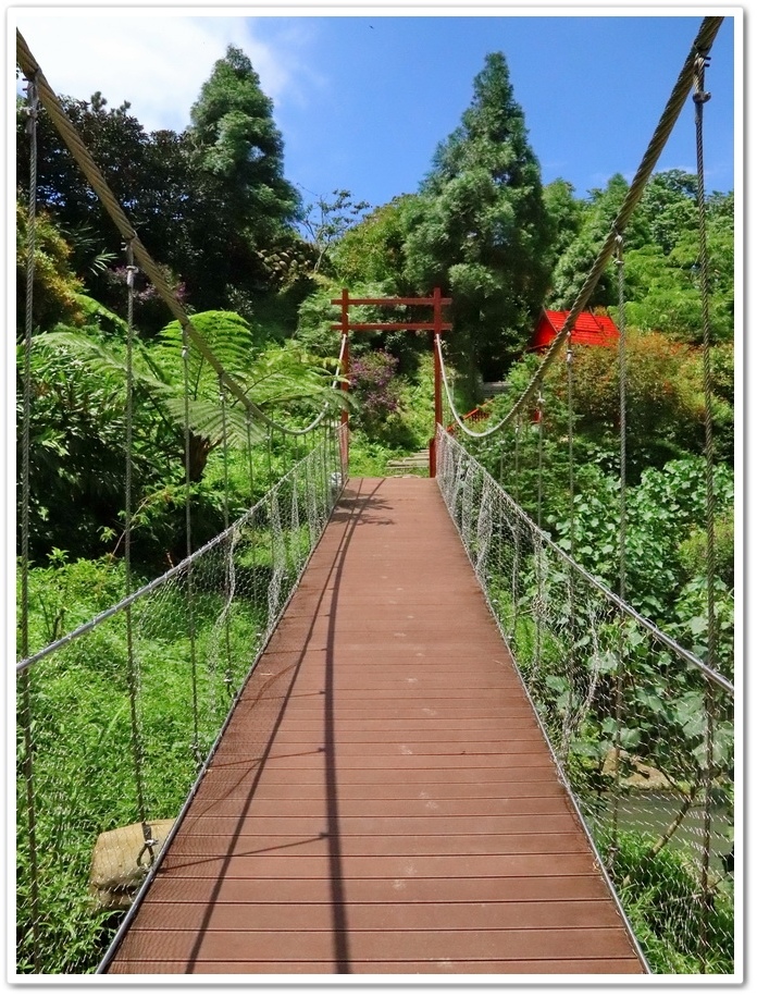 紅色吊橋與紅色發呆亭,在一片綠意的山林中,顯得相當的美
