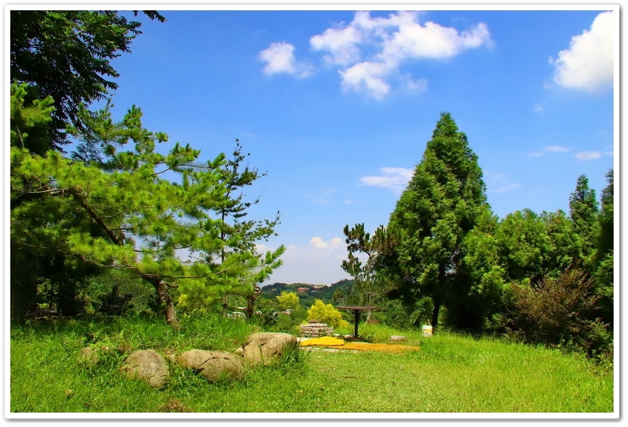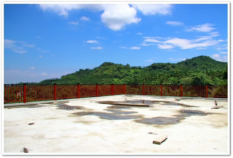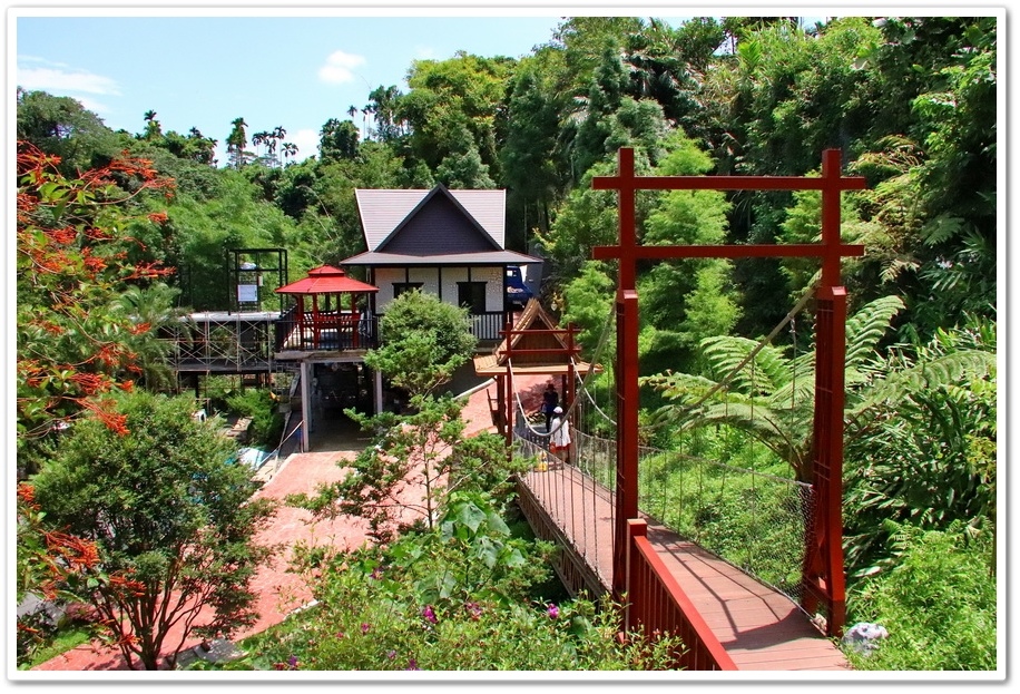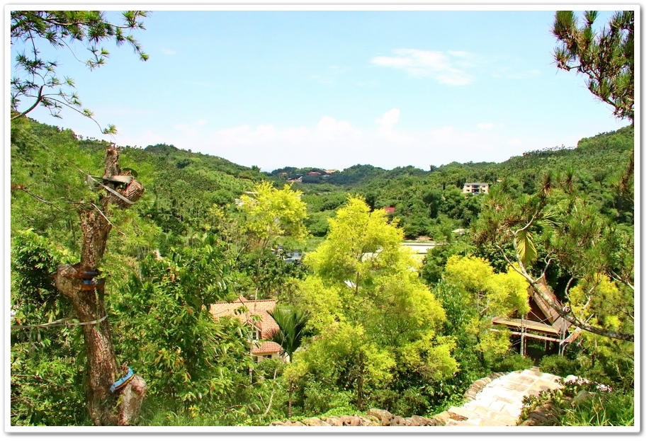 走過紅色吊橋,再循石階而上,這裡是一處平臺,可以眺望底下園區的景色