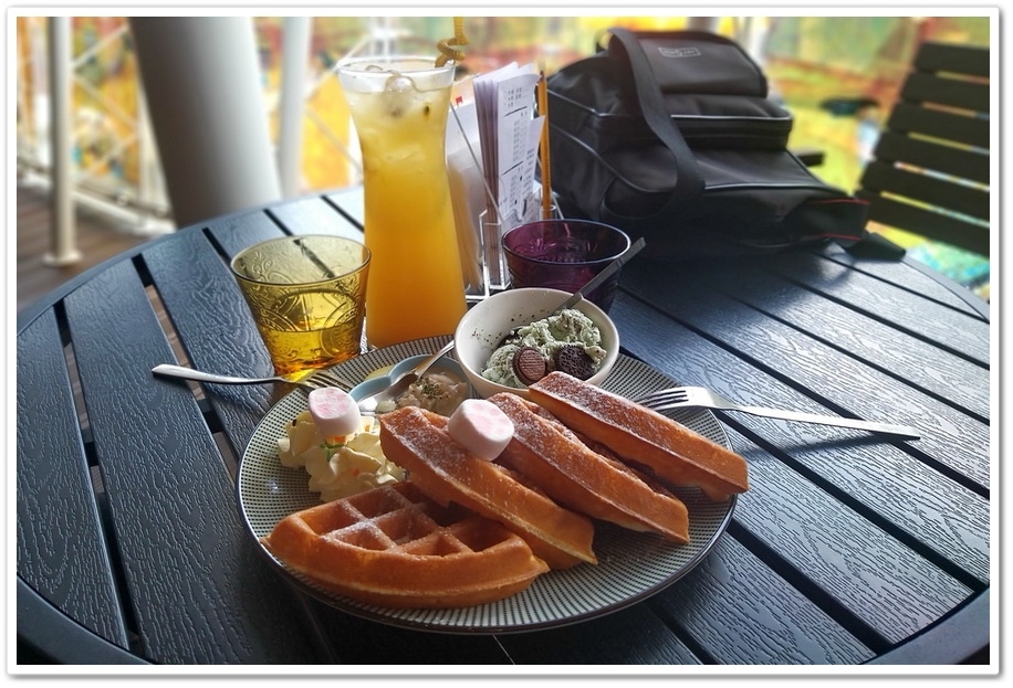我們點了綜合鬆餅200元,有鲔魚、奶油、冰淇淋三種口味,及一杯柳橙愛上檸檬150元