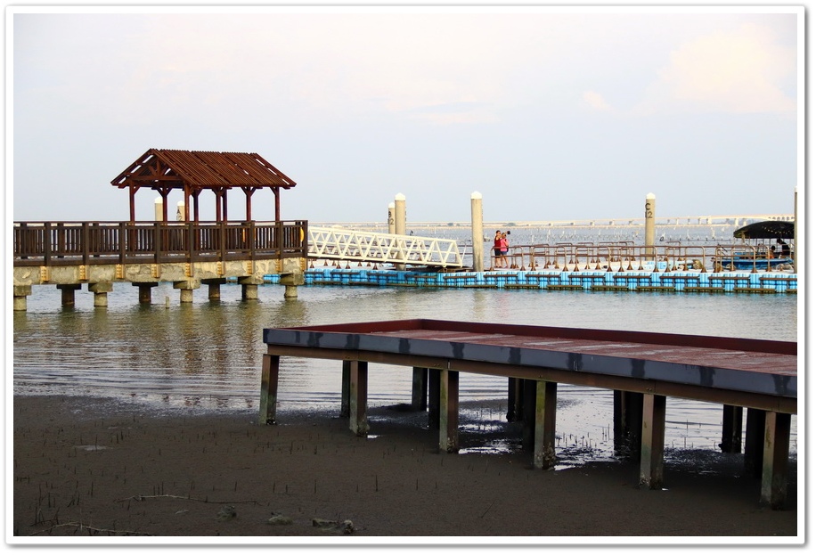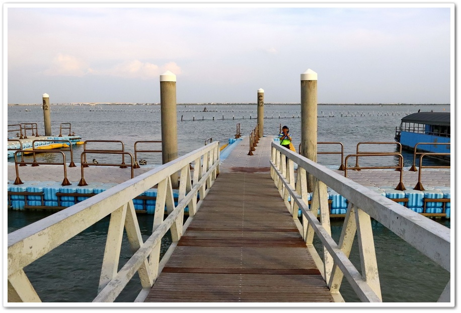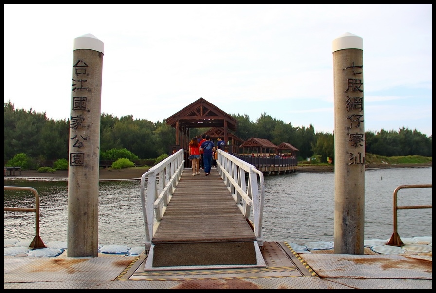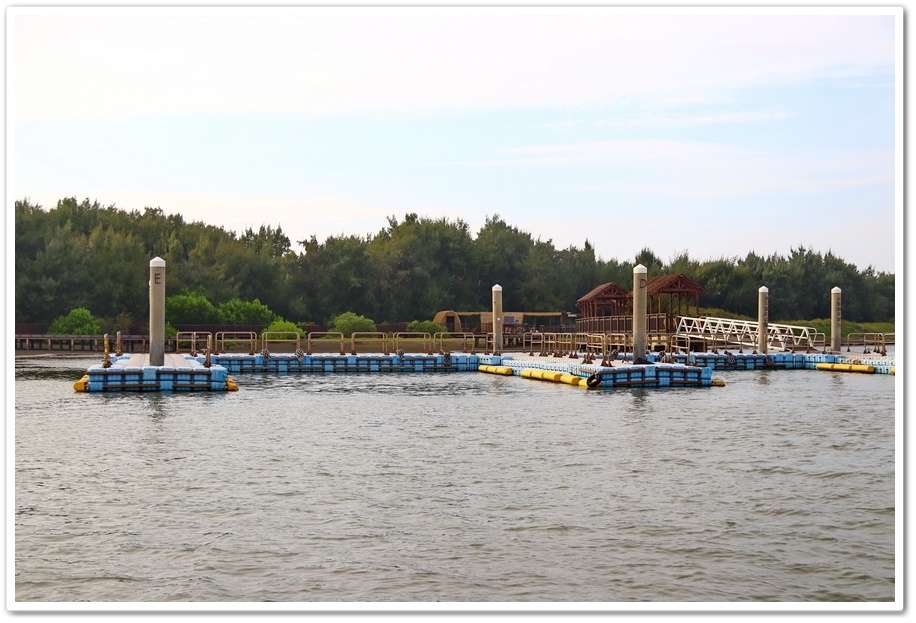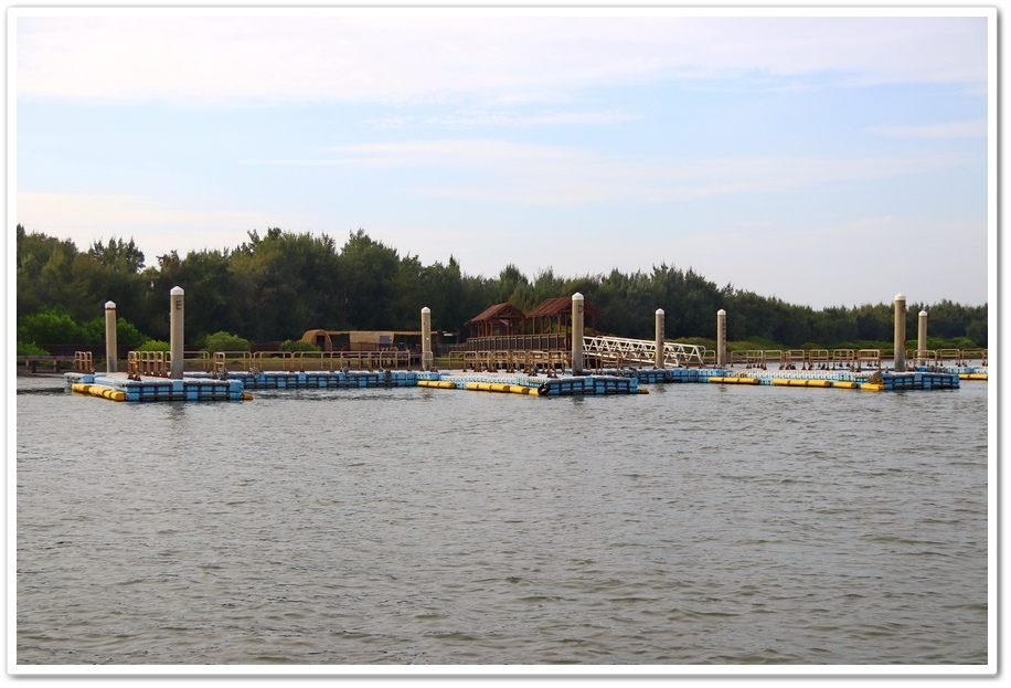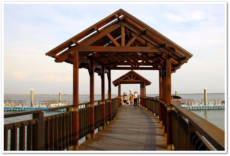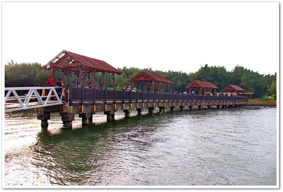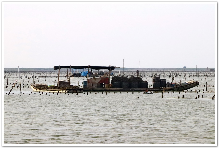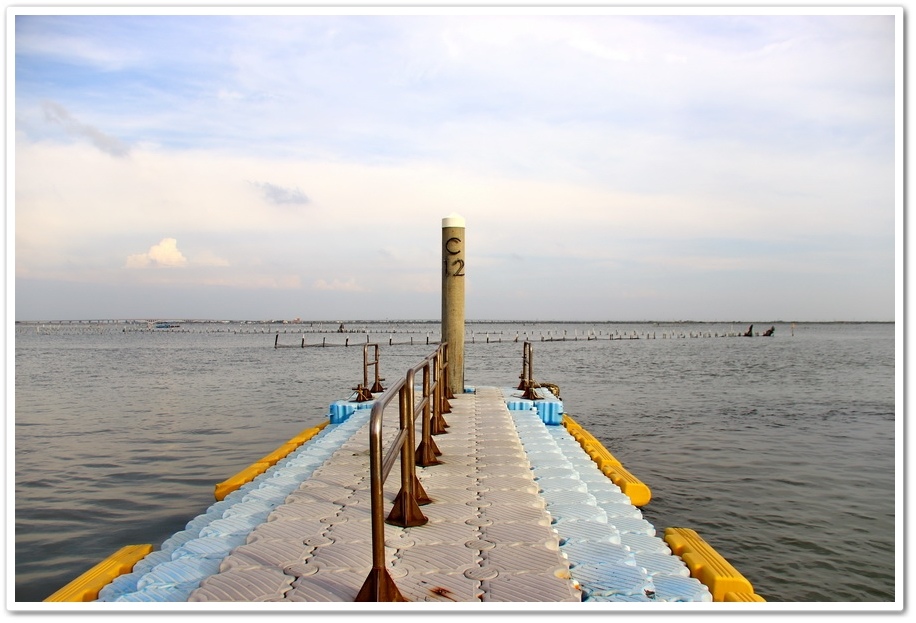 回到碼頭,往岸邊看過去,有『蟹形步道』,兩隻螯突入海岸。在七股潟湖中的蚵架又是另一種風情,隨著水深的不同發展出浮棚、吊棚、倒棚三種養蚵的方式
