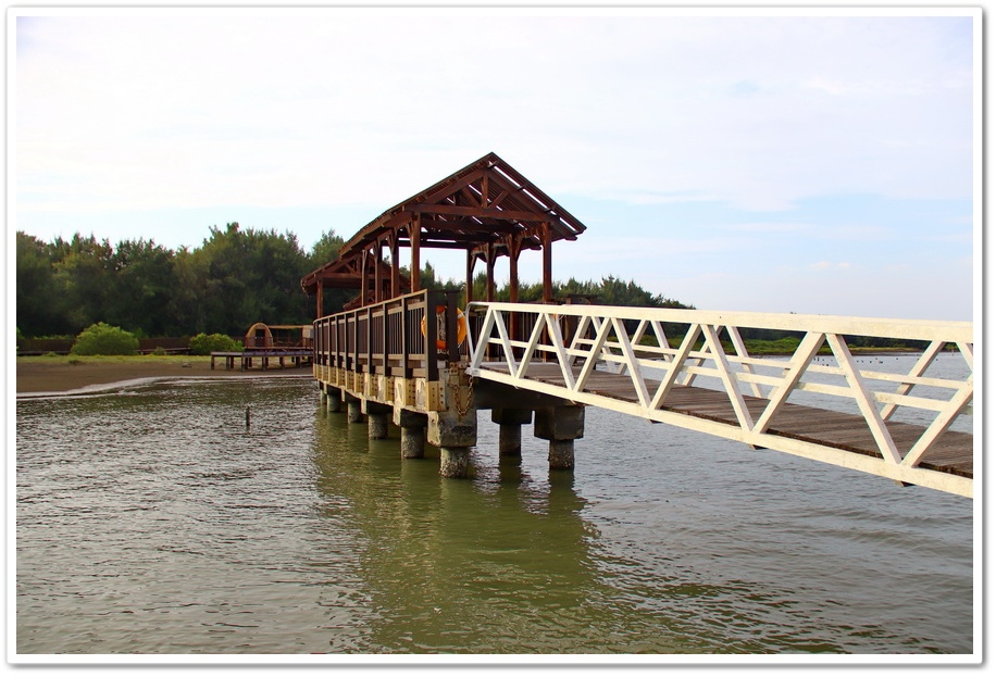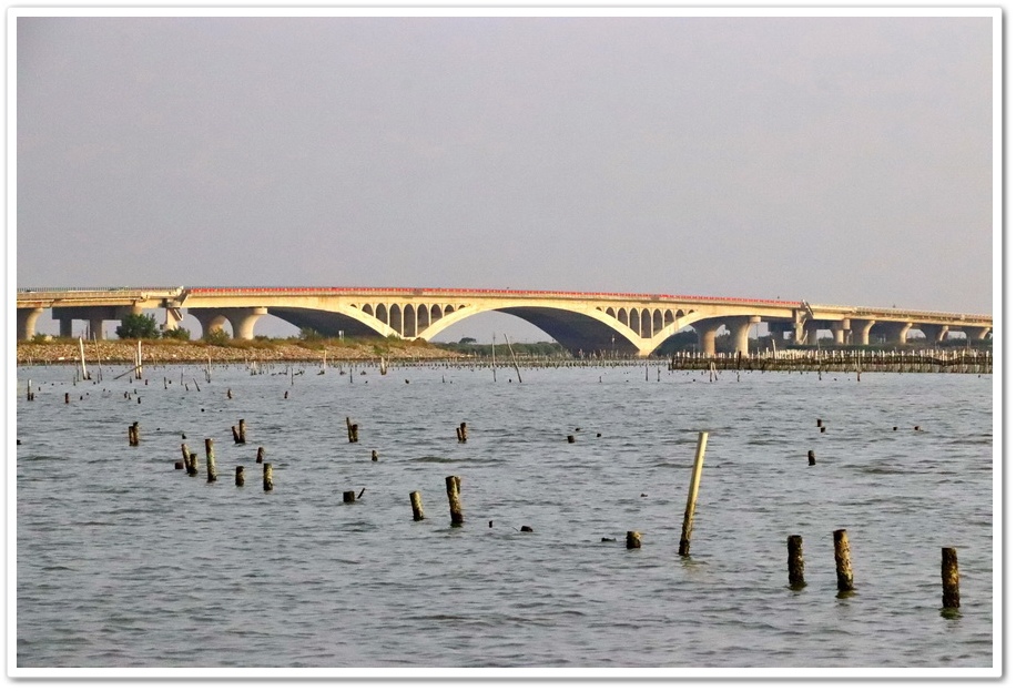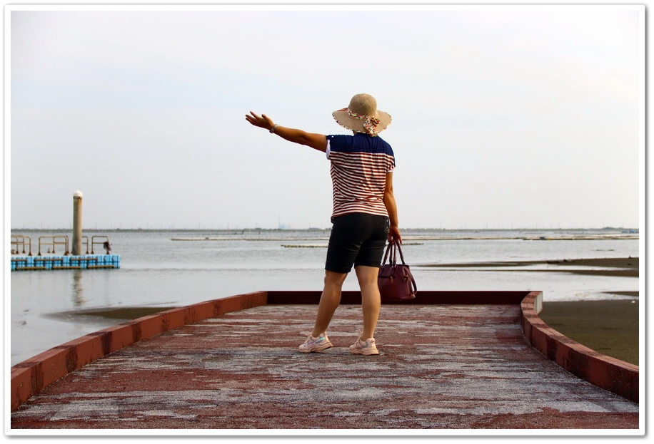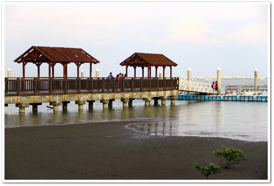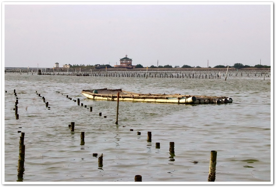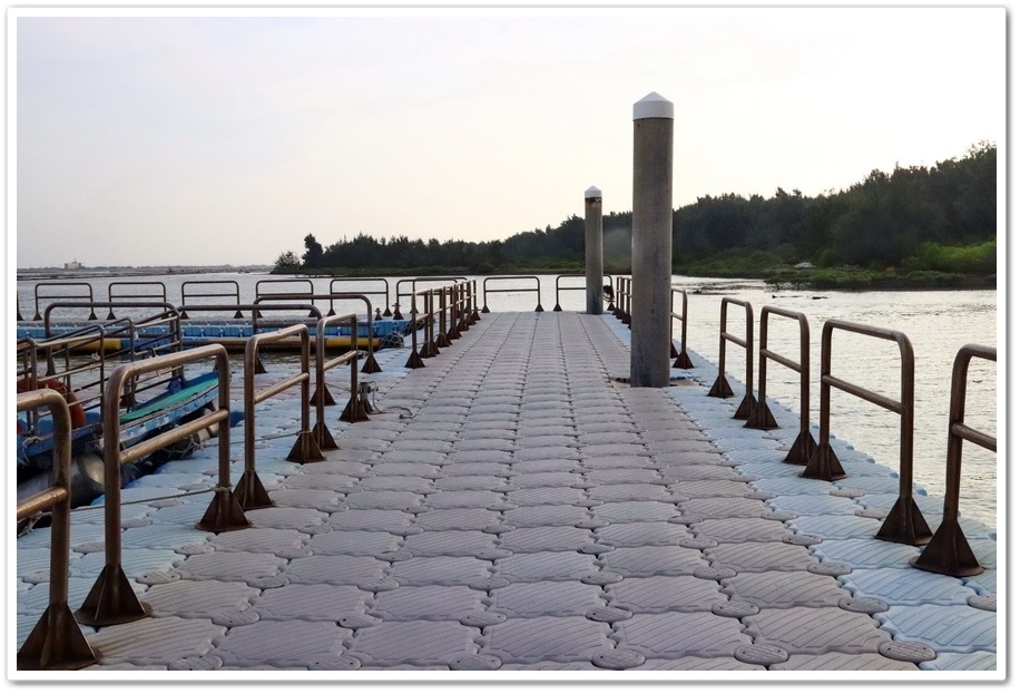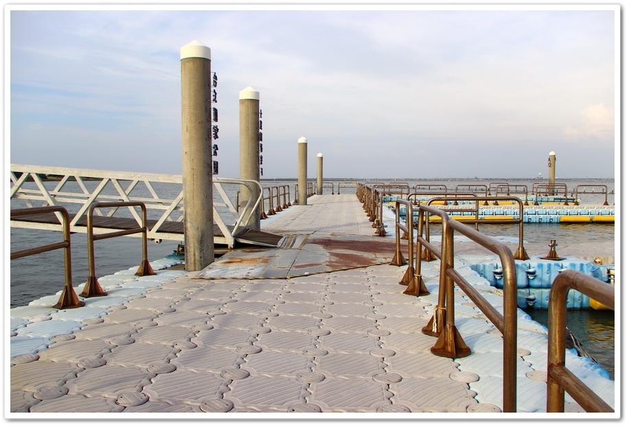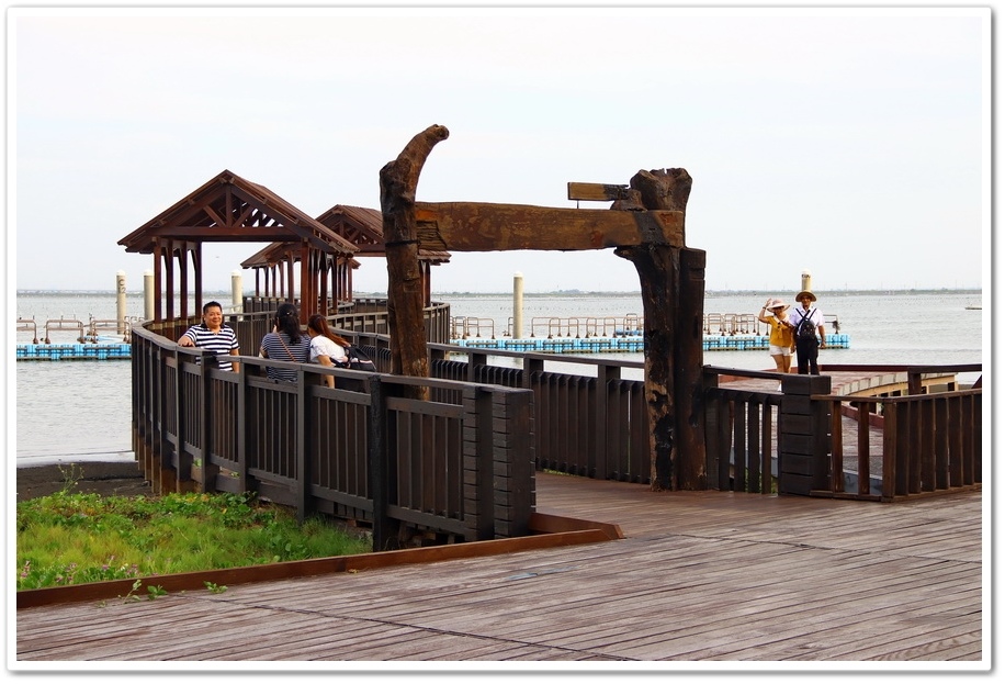 回到碼頭,往岸邊看過去,有『蟹形步道』,兩隻螯突入海岸。在七股潟湖中的蚵架又是另一種風情,隨著水深的不同發展出浮棚、吊棚、倒棚三種養蚵的方式