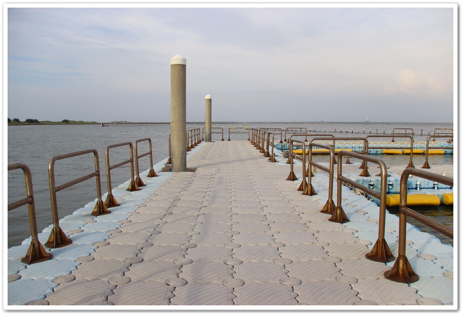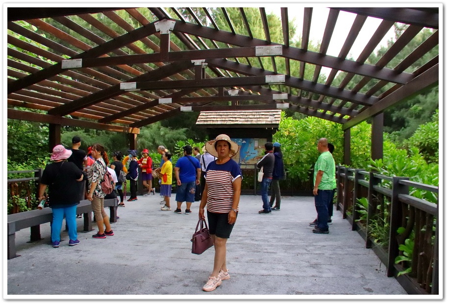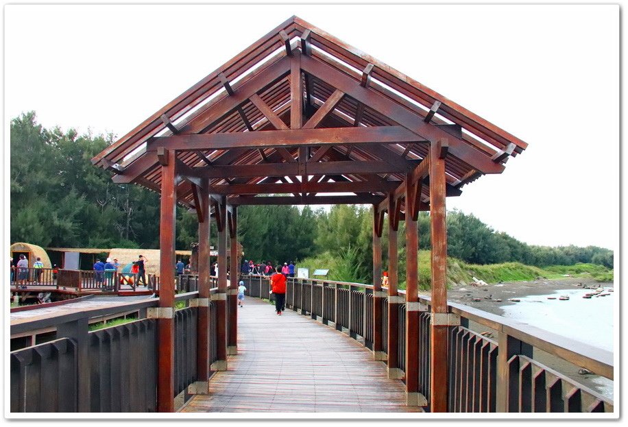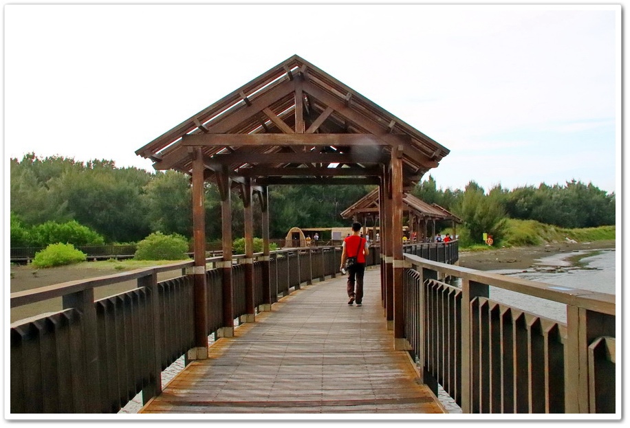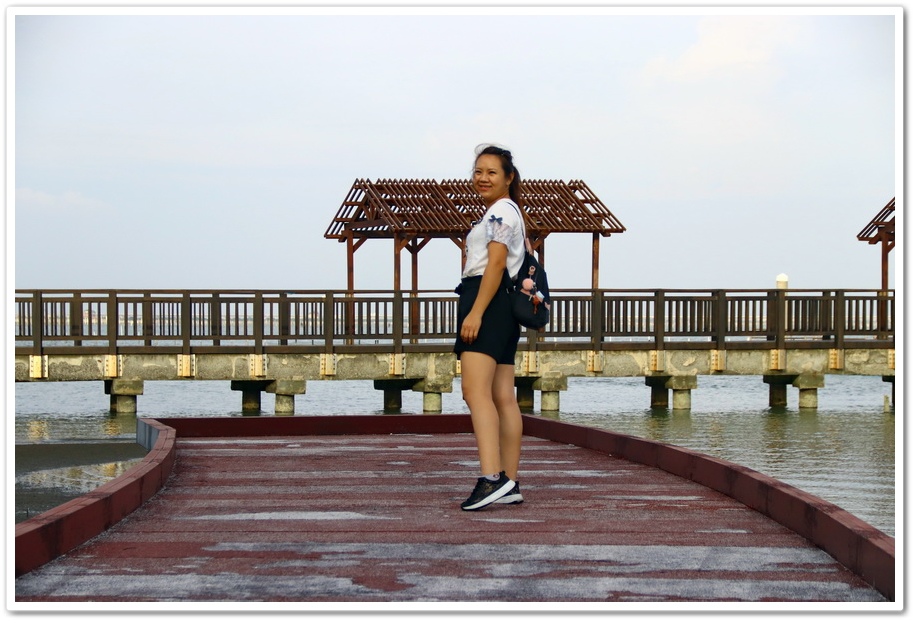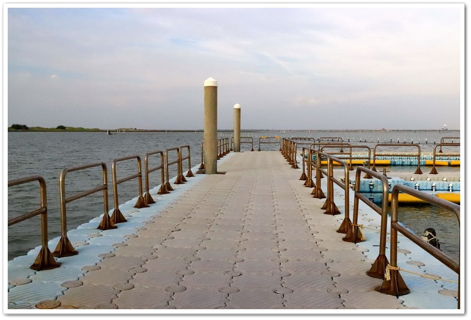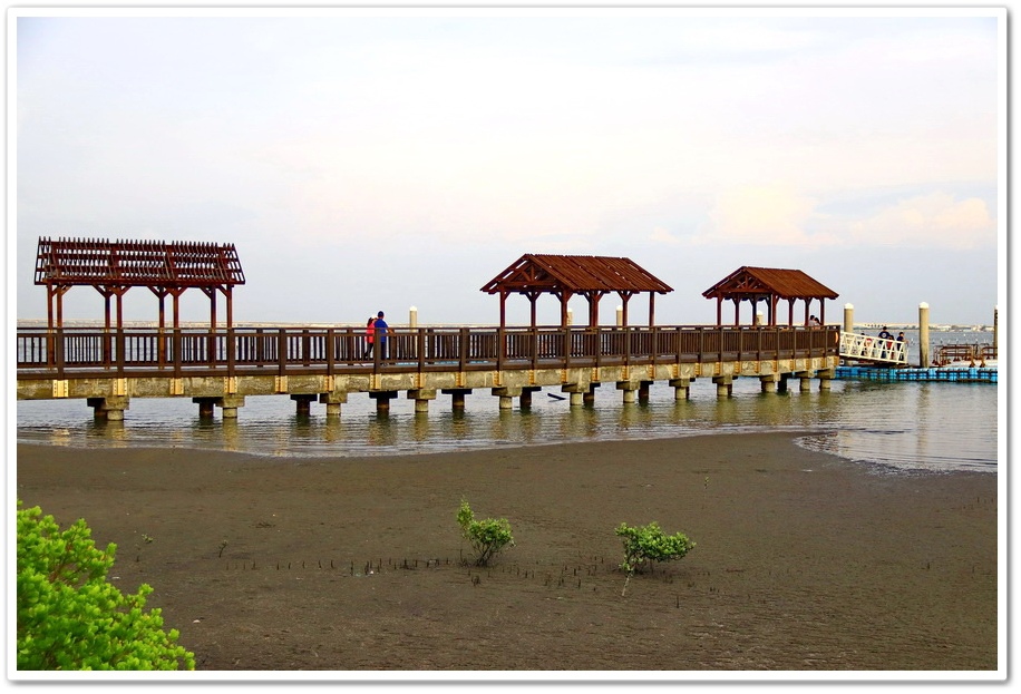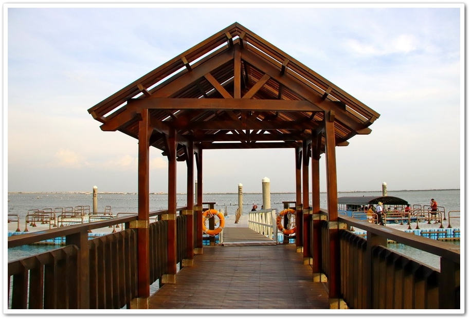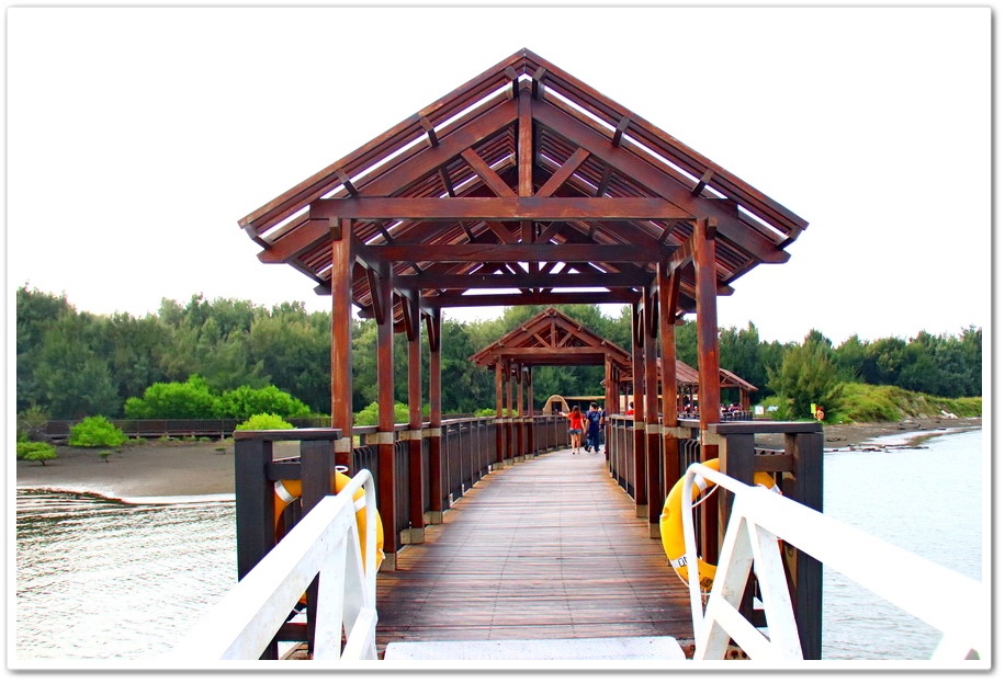 回到碼頭,往岸邊看過去,有『蟹形步道』,兩隻螯突入海岸。在七股潟湖中的蚵架又是另一種風情,隨著水深的不同發展出浮棚、吊棚、倒棚三種養蚵的方式