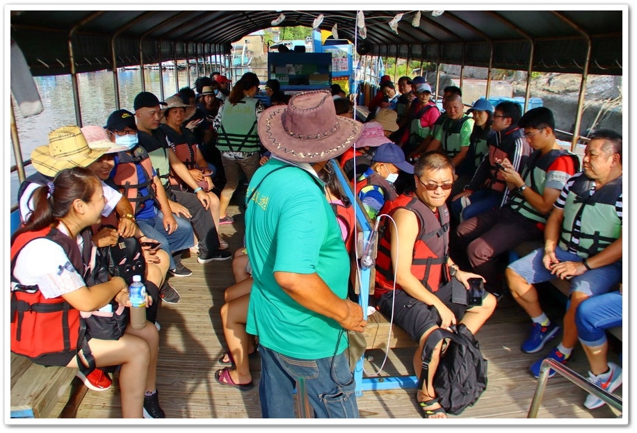 前排就是我們『八色鳥愛玩團』年輕又漂亮的女導遊,首先我們來到台南七股潟湖『龍山號觀光竹筏』坐船準備出海,在出海之前船家會讓遊客『烤蚵吃到飽』,沒有時間限制,一直吃到開船時間到為止