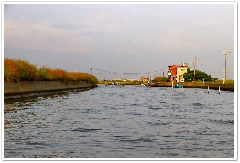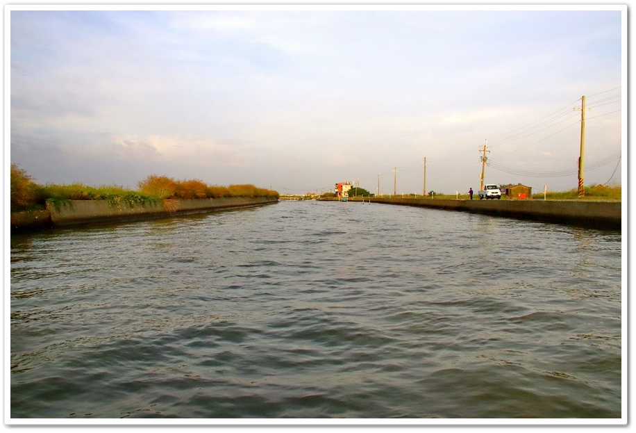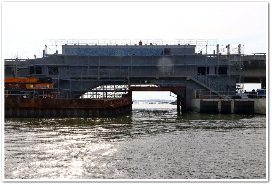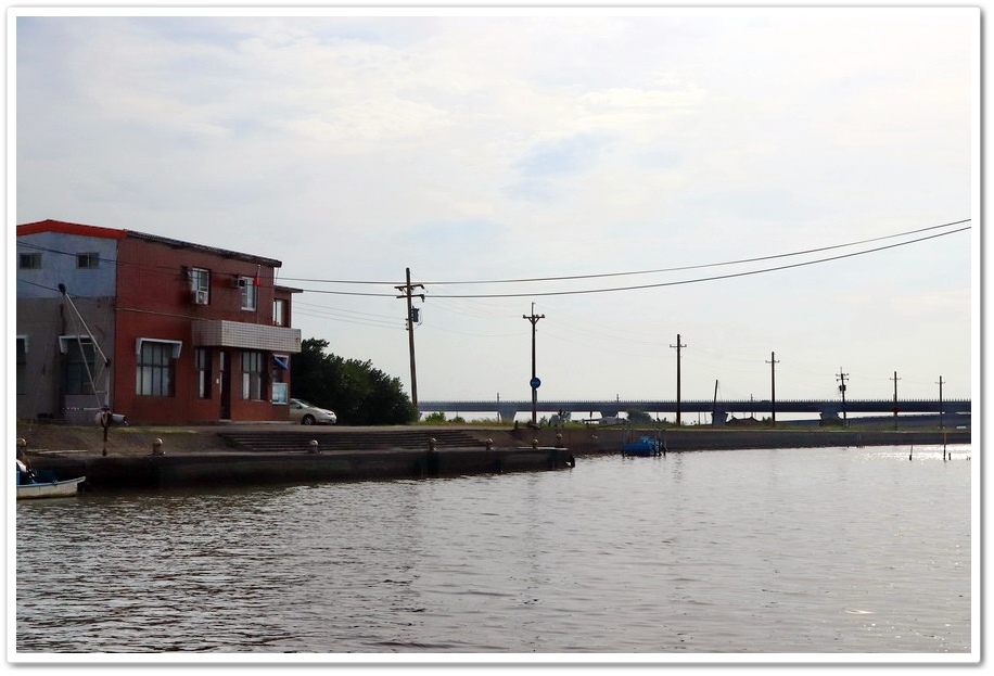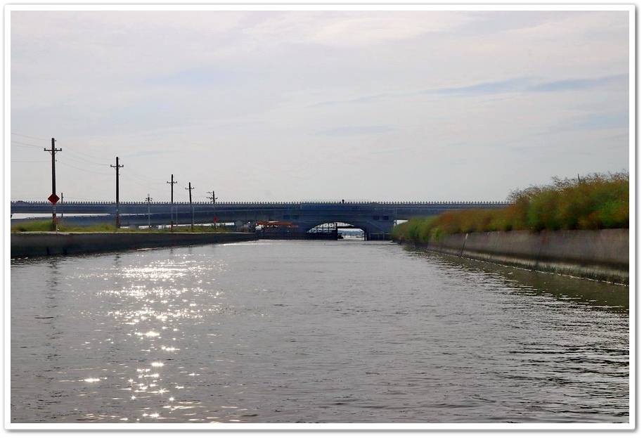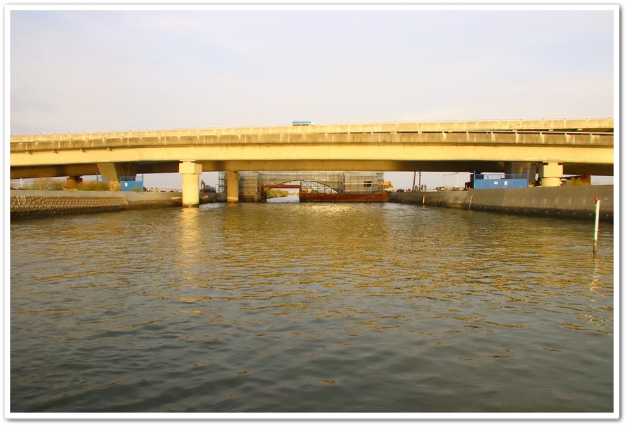 竹筏由『龍山漁港』航行於『六成大排水溝』出海,會經過一處『海巡隊檢查哨』,然後再穿過『台61線濱海道路』底下才能到達『七股潟湖』,『六成大排水溝』上方不知道在施做什麼工程,看起來很像一座城堡