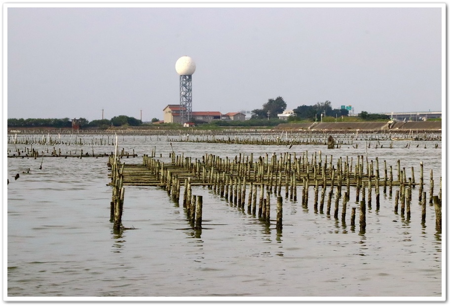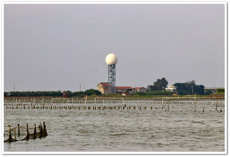 前方白球是經歷地方12年的抗爭,遠離居民聚落的台南『七股氣象雷達新站,在2019年7月24日開工,設計上融入黑面琵鷺、鹽田鹽山等地方意象,施工過程配合自然生態,每年10月起到翌年3月的候鳥季都會停工,完工後將於2020年底正式啟用