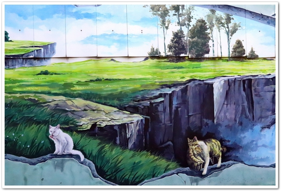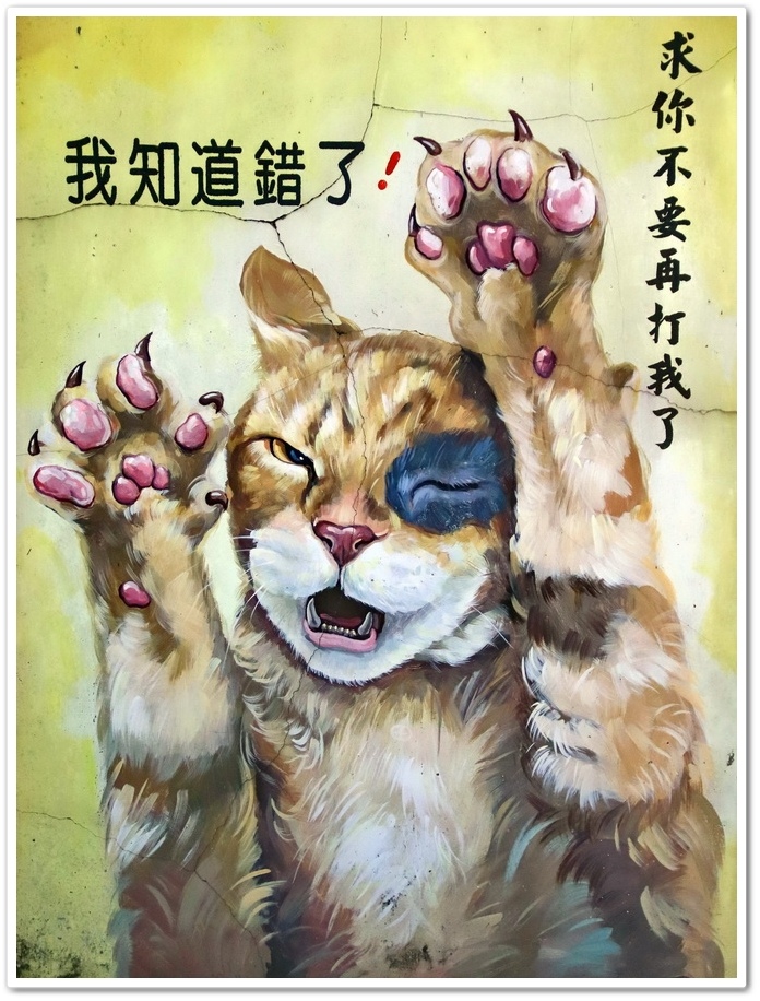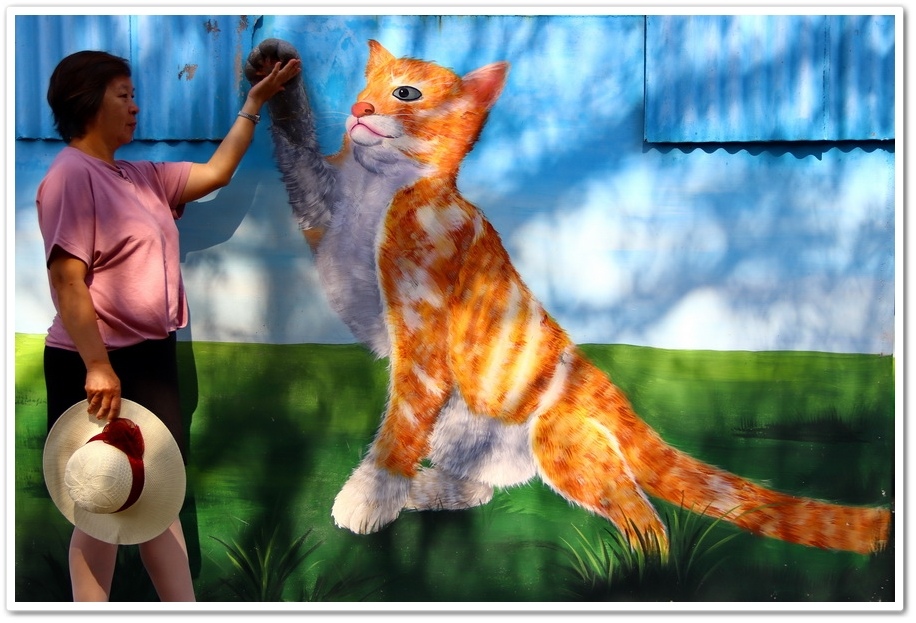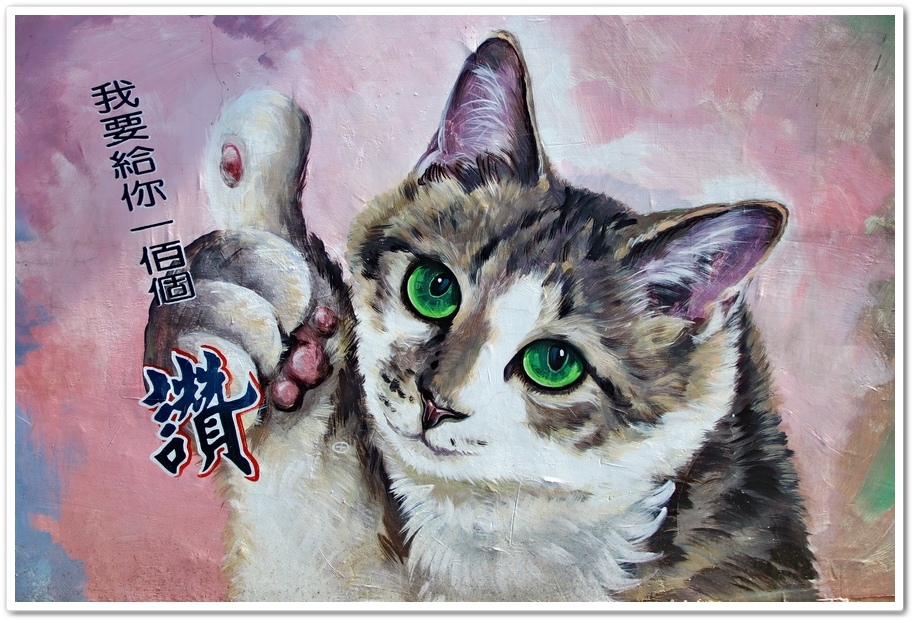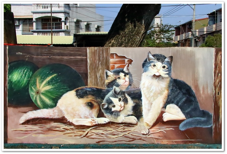 以『打貓』為主題,營造出以貓為主的社區彩繪,範圍雖不大,但逗趣的互動構圖,以及逼真的立體彩繪,仍然具有相當吸引力