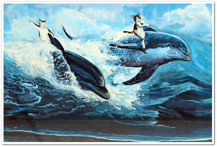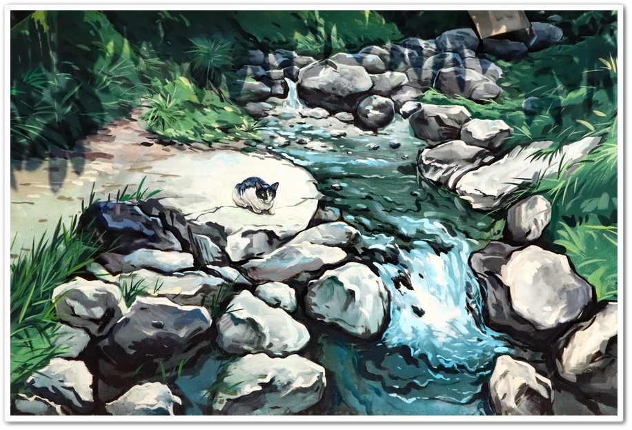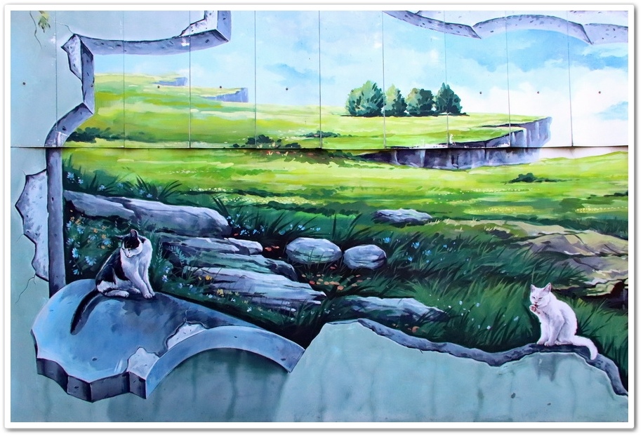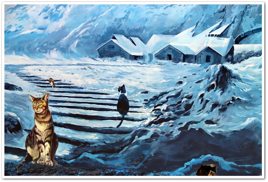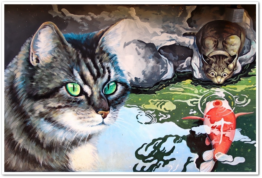 偏遠的小村莊,壁面與建築外牆上繪滿栩栩如生、多采多姿的貓咪圖案